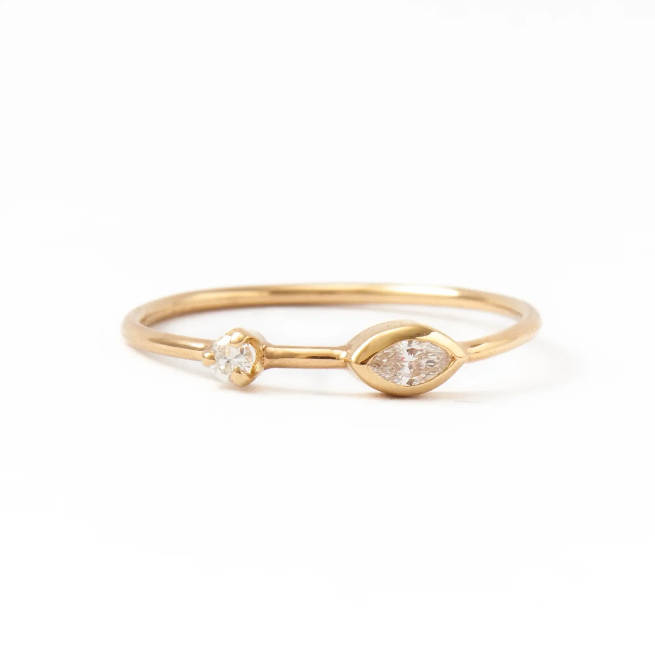 Fans of subtle asymmetry will find their match with this dainty stacker by Los Angeles-based Zoe Chicco. A bezel-set marquise diamond accented by a sparkling round diamond packs a powerful punch in a tiny package. Made in the USA.