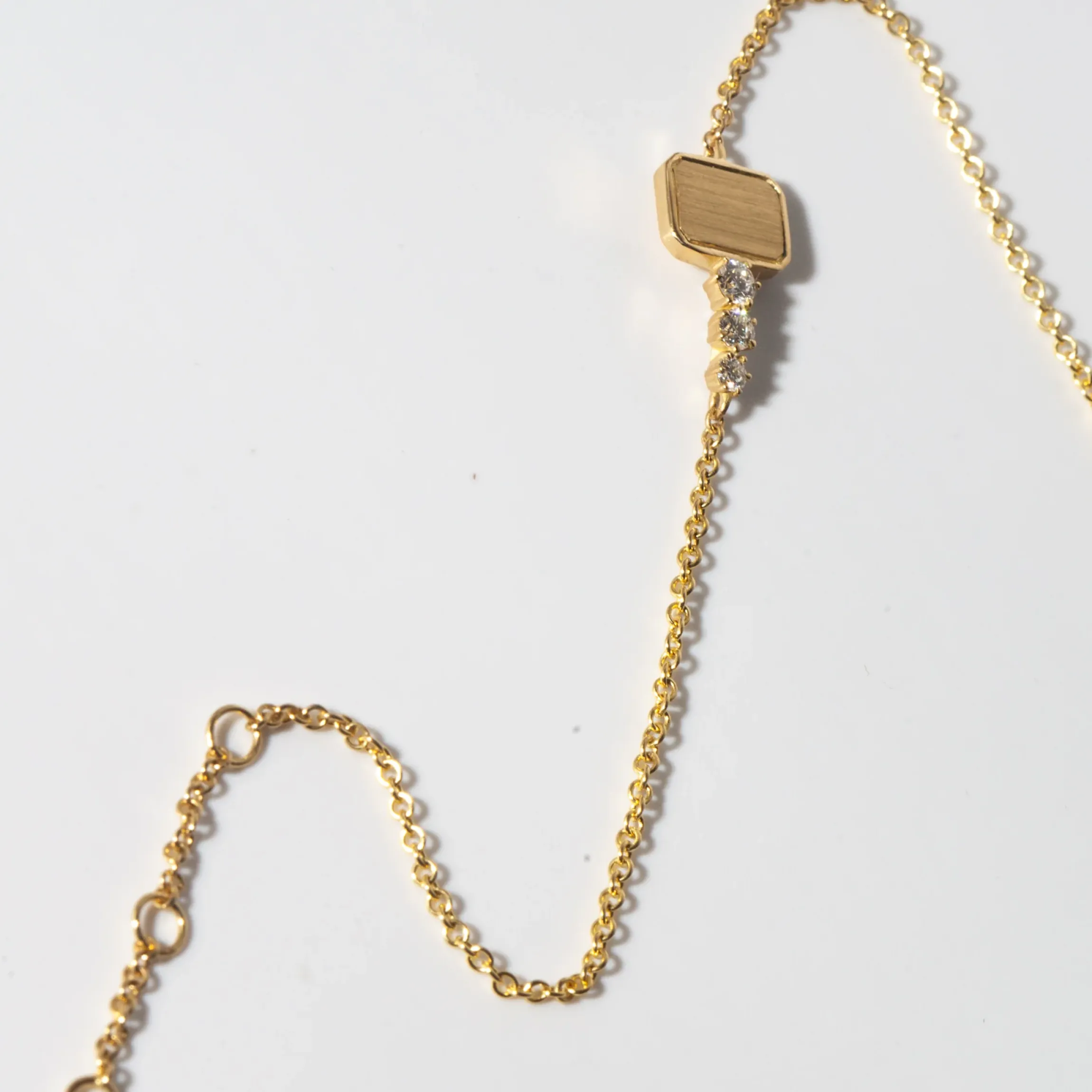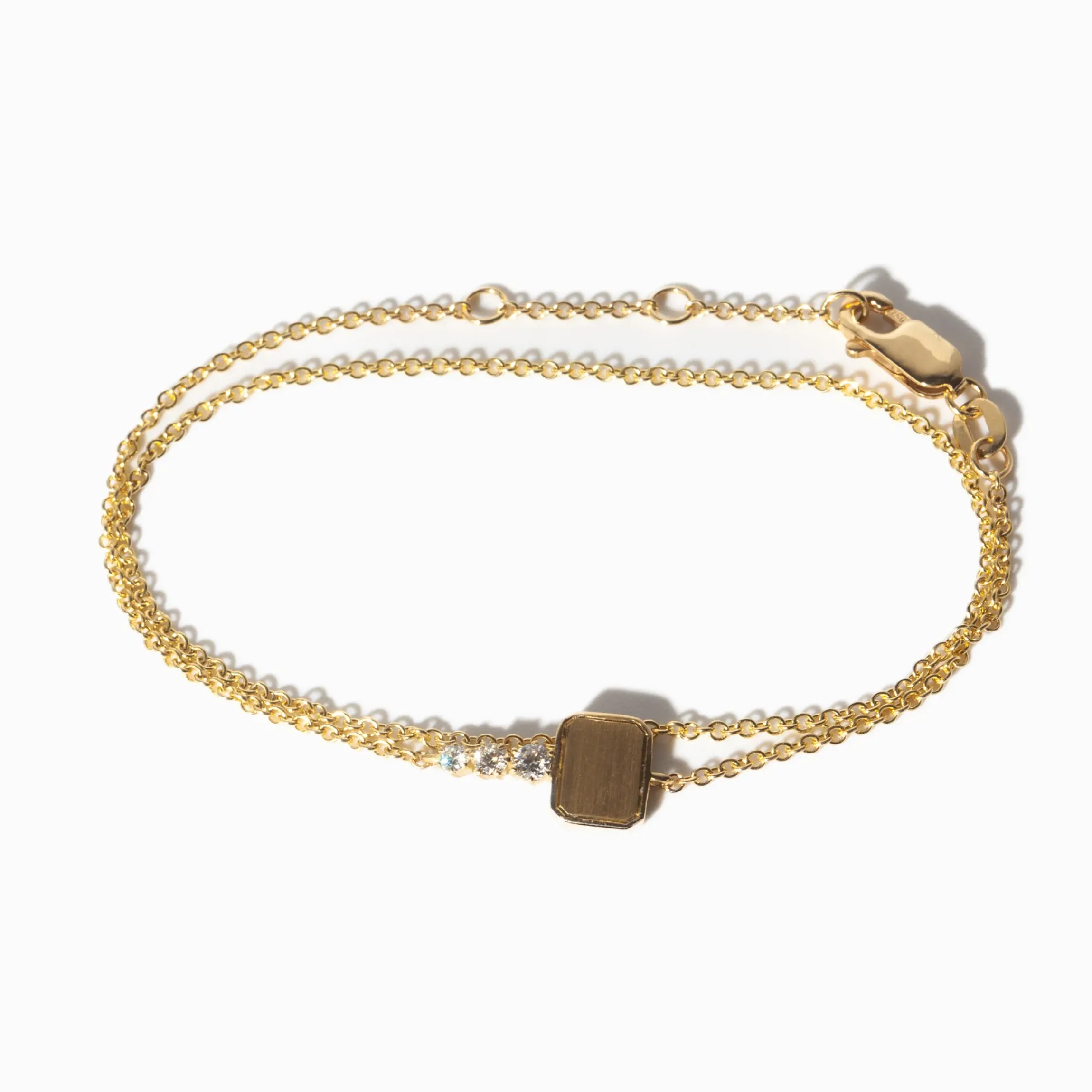 This exquisite key charm sits gracefully on a dainty, golden bracelet, delicately wrapping around your wrist twice. Adorned with three stunning diamonds placed in Jade Trau’s iconic “Catherine” prong setting, its sleek surface provides the perfect opportunity to personalize with your birth date, initials, or something meaningful to you. A must-have addition to your collection, this bracelet exudes luxury and elegance. Made in the U.S.A.
