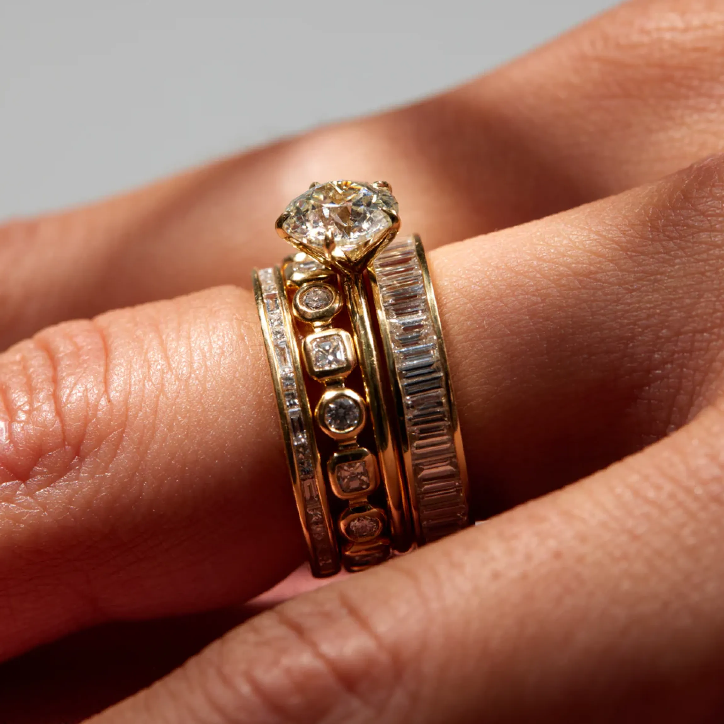 This new channel-set band by The Future Fine sparkles like a current of light flowing from a stream of gold. A pattern of baguette and princess-cut diamonds alternate three-quarters of the way around the band, making it a versatile stacker that pairs beautifully with any engagement ring.