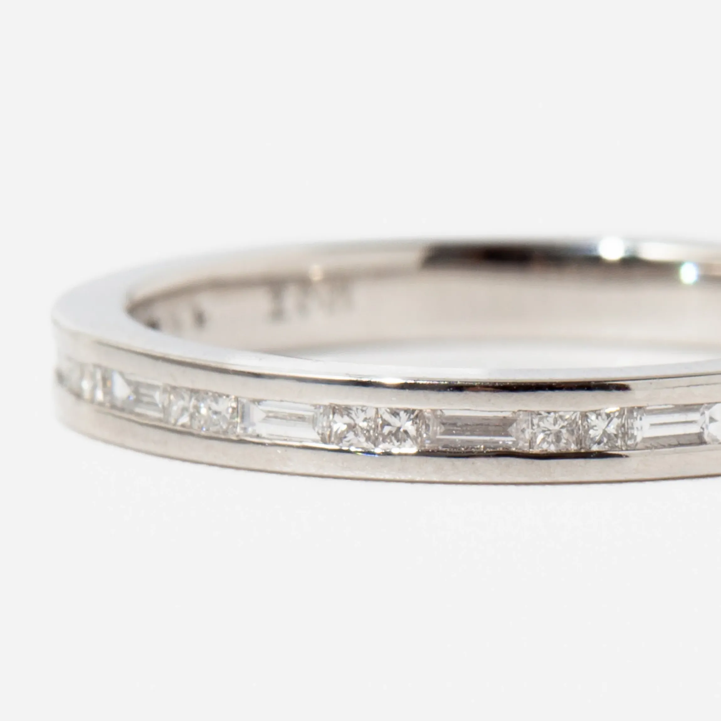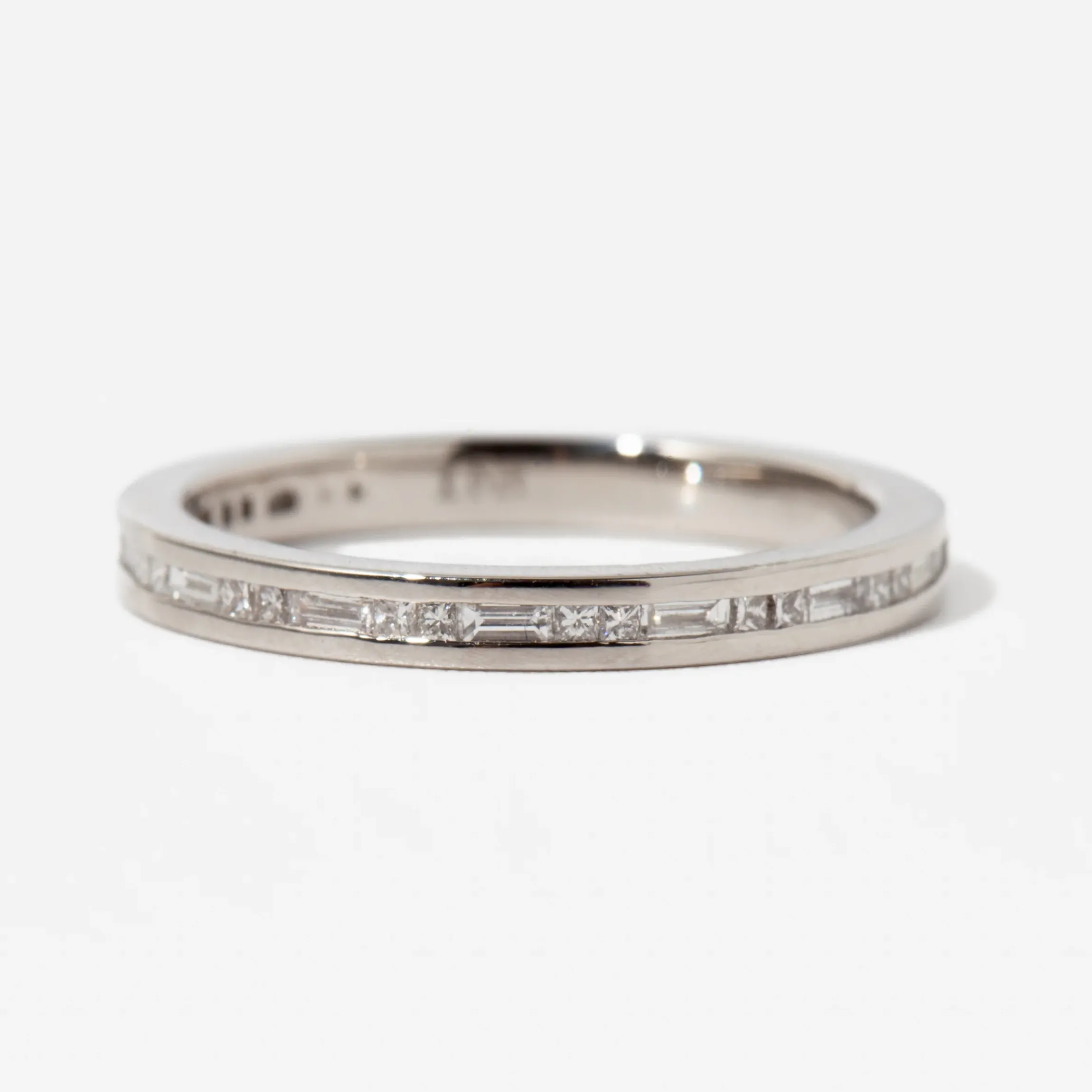 18 karat yellow/white gold or Platinum set with 20 princess-cut diamonds and 9 baguette diamonds totaling 0.29 carat. The band measures 2 mm wide.