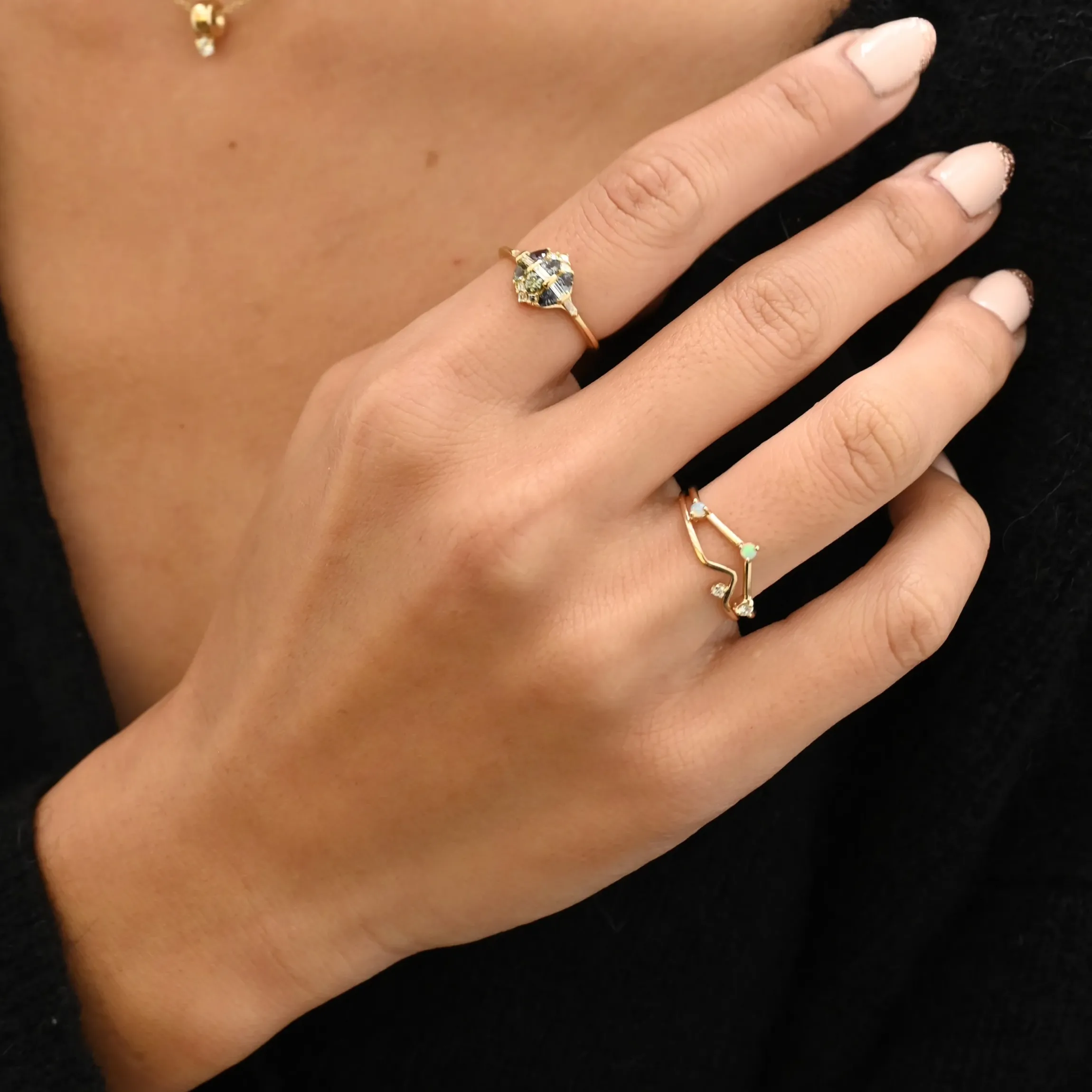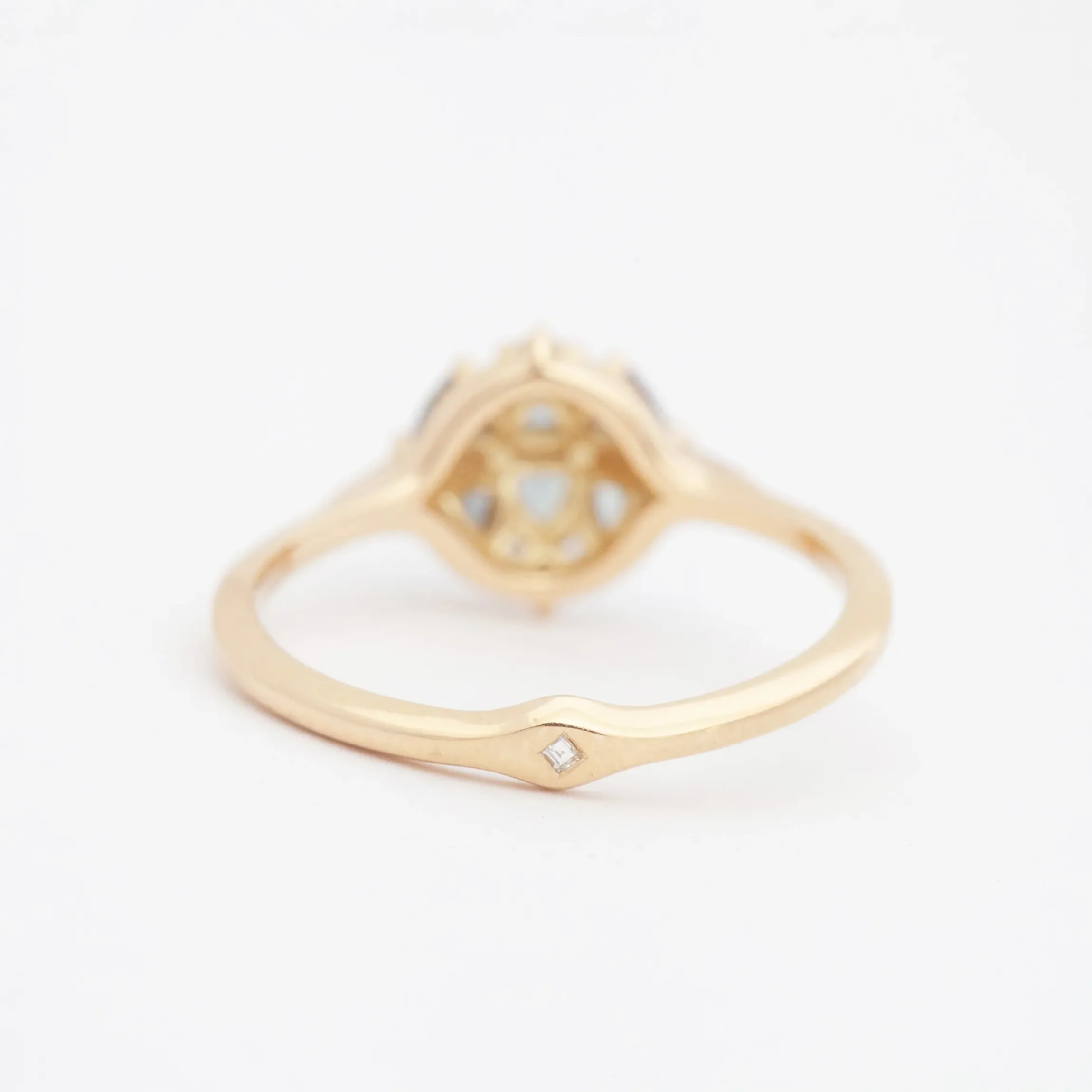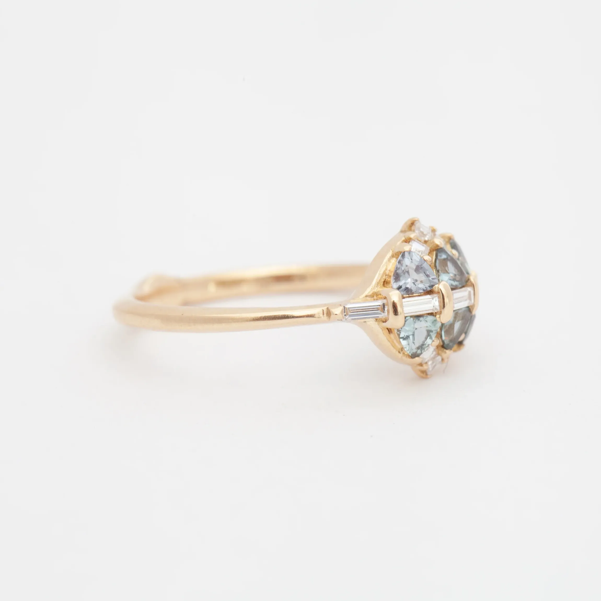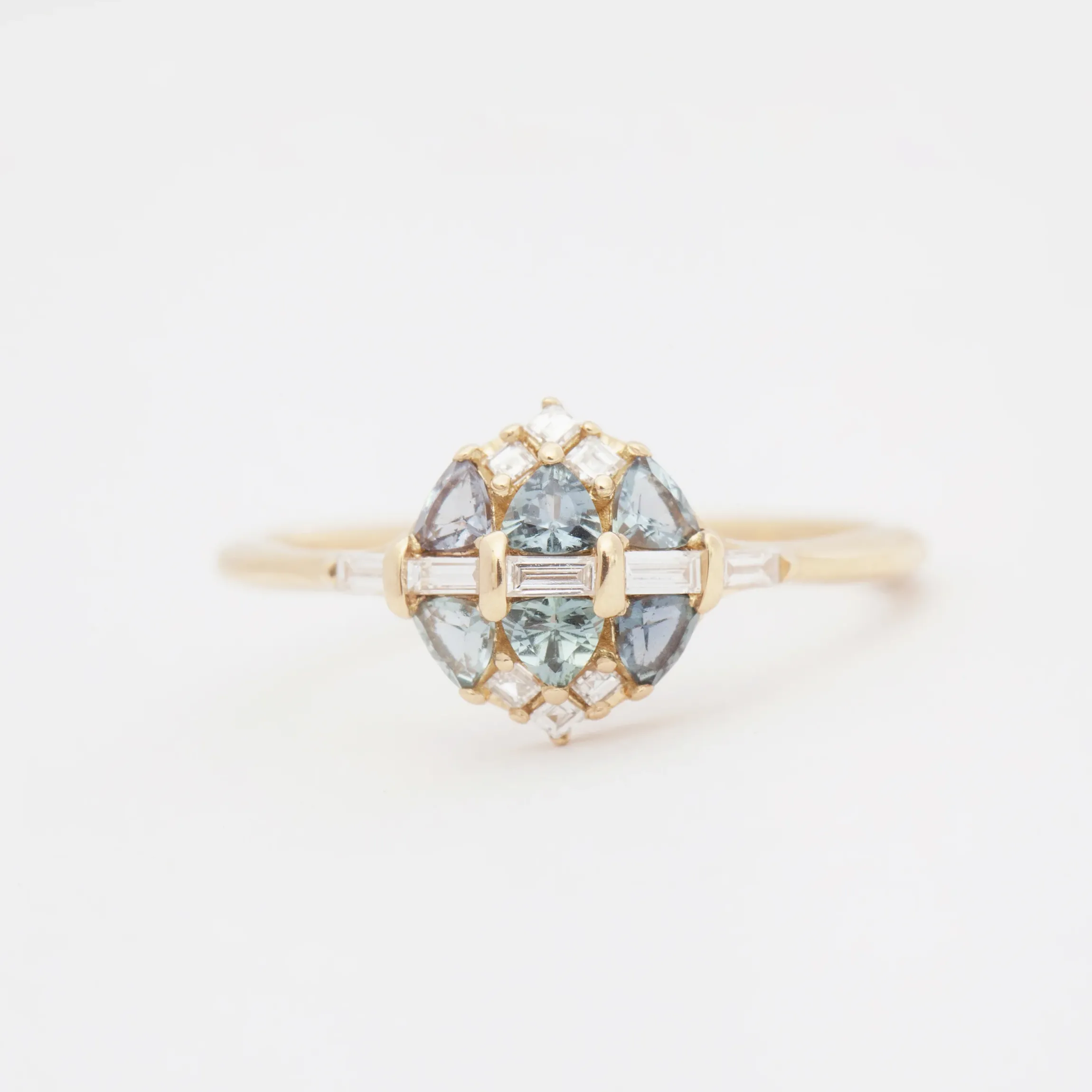 Words won’t do any justice to the beautiful complexity of this petite cluster-style ring, but we’ll try our best. A clever raised setting lets six trillion sapphires slope down toward the finger in a gentle curve of colorful sparkle. White step-cut diamonds cut through the center in a slim line and crown the top and bottom for a playful geometric design that you’ll spend the rest of your life admiring. Regal, yet easy to wear, this unique ring exemplifies Artemer’s updated Art Deco aesthetic in a surprisingly new way. Made in Israel.