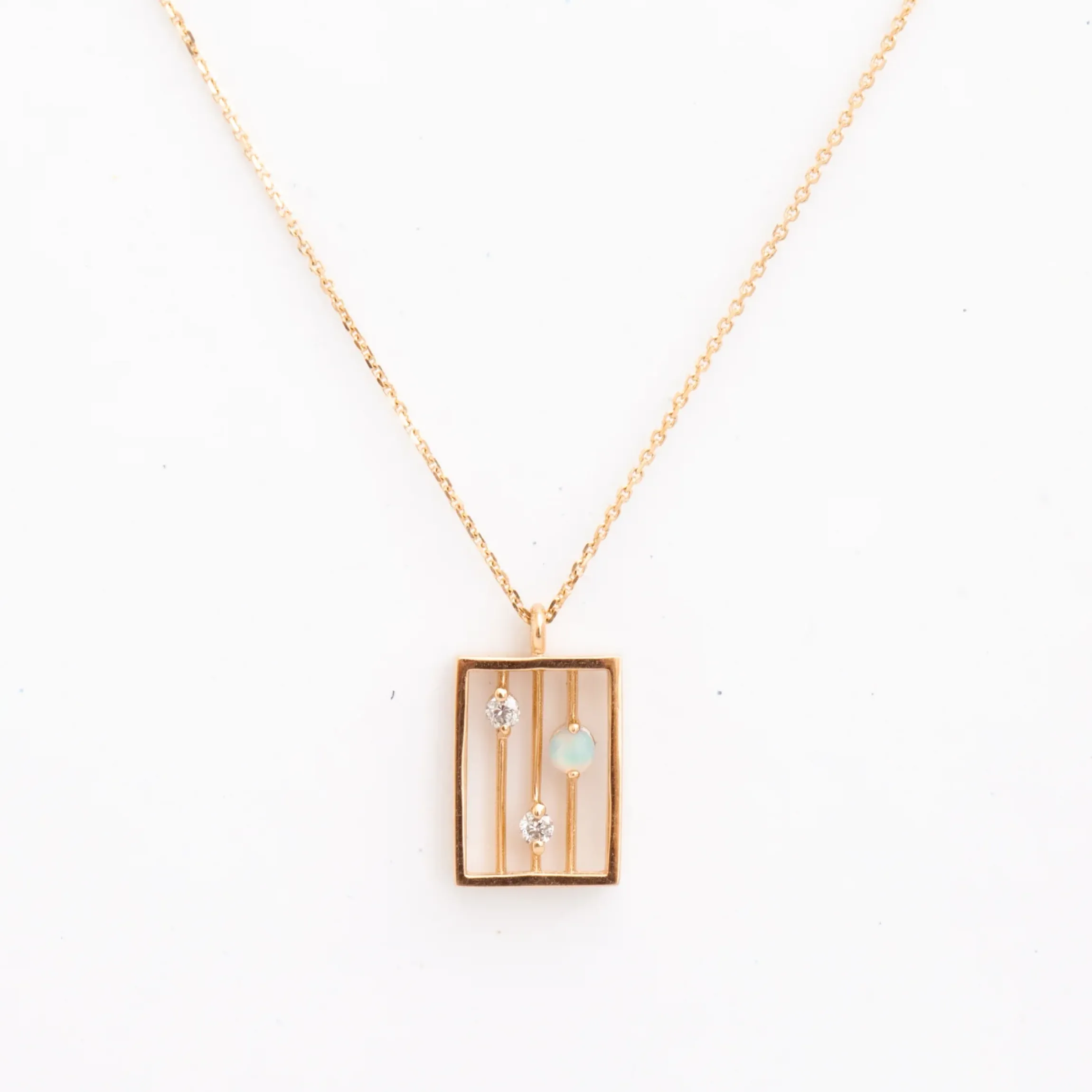 A golden frame, three bars, and three stones—this necklace sounds simple enough, but its careful assembly makes it a masterpiece in miniature. Delicate diamonds paired with an Australian opal appear to float on slender gold rods within a solid gold pendant for a lovely sparkle that contrasts against flashes of your skin underneath. Pair it with a shorter, textured chain for an elegant combination of lengths and finishes. Finished with a spring ring clasp. Made in the U.S.A.