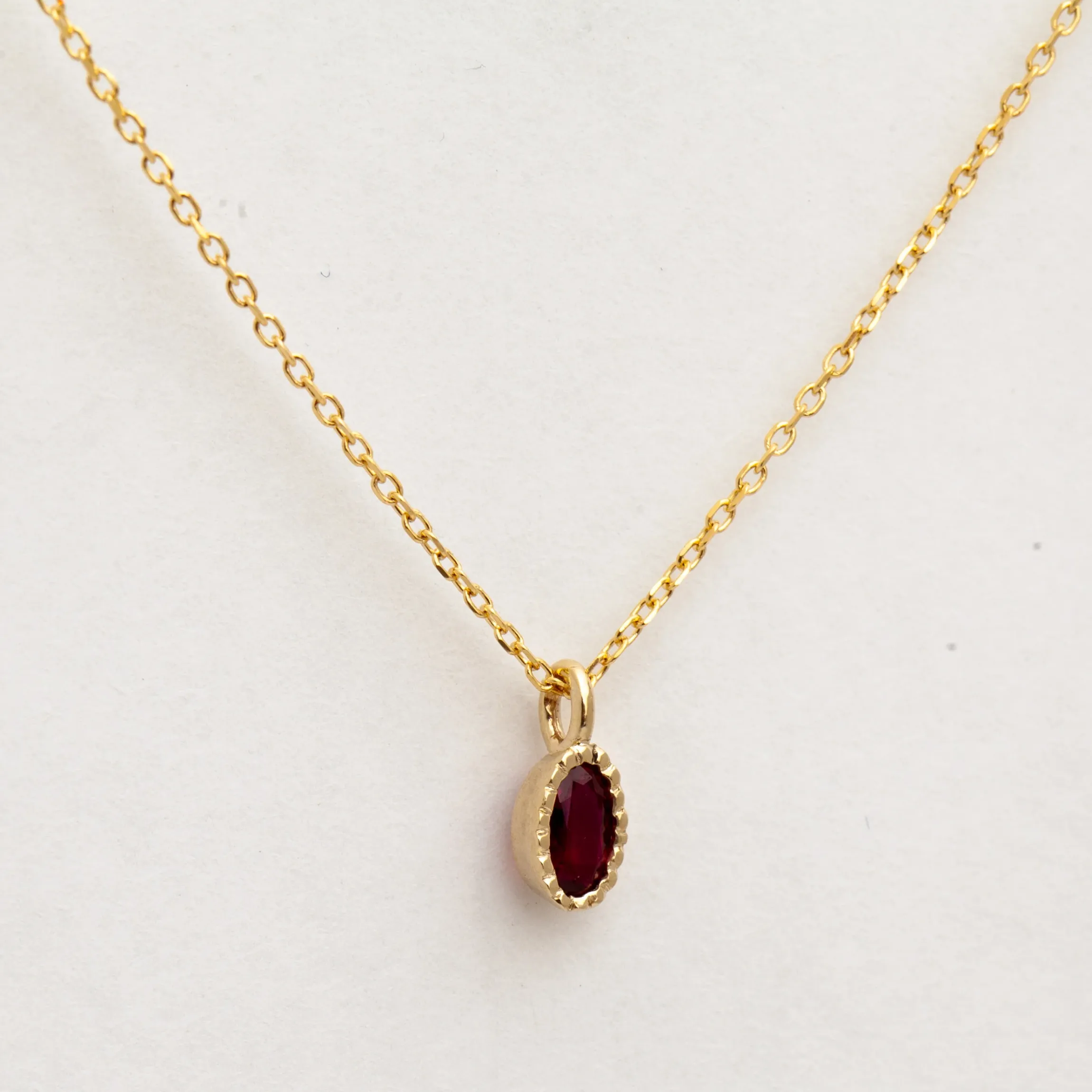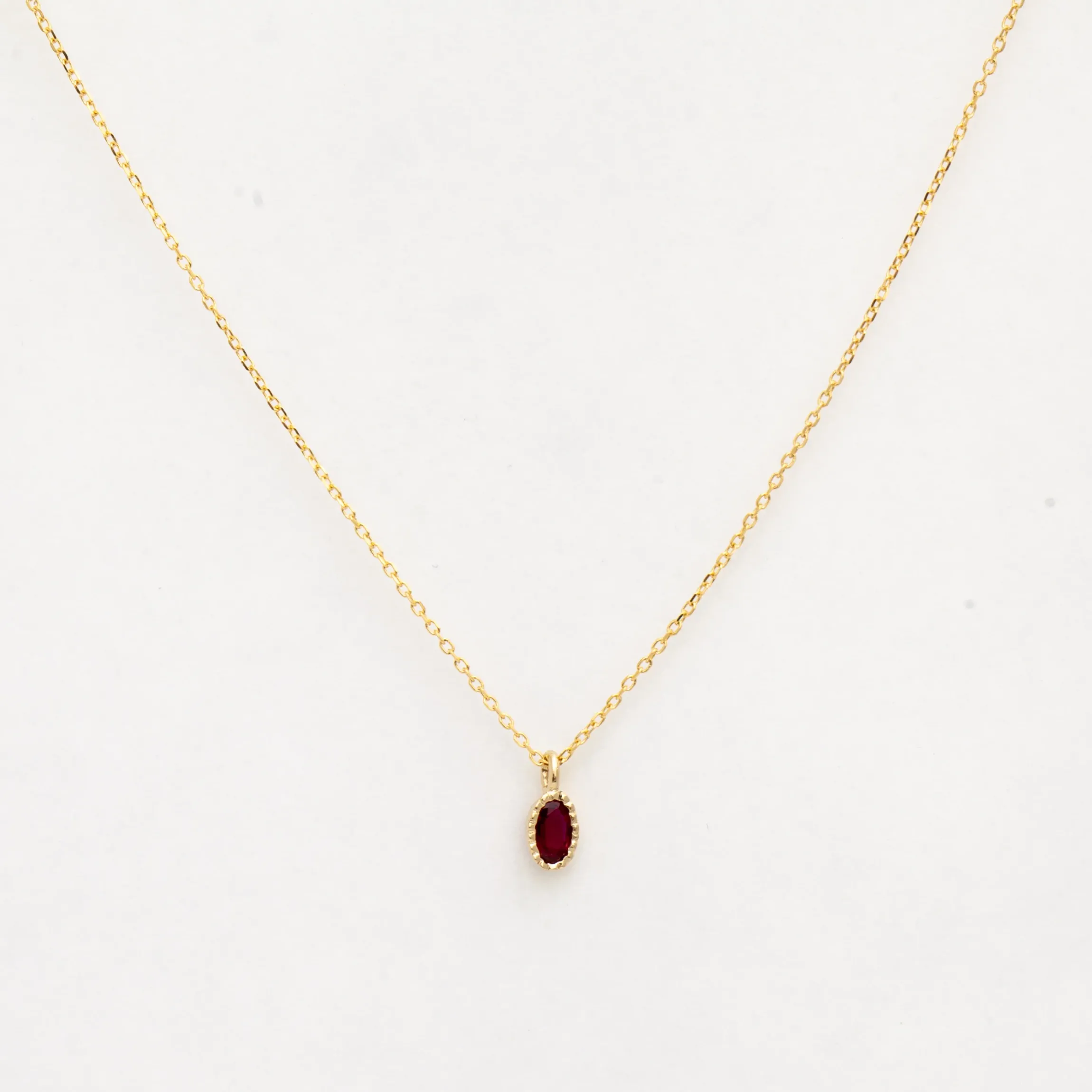 Introducing our top-selling Ruby Wisp Necklace, now with an oval cut! The deep, bold color of the ruby is set in a slim bezel and accented with delicate milgrain, bringing a touch of antique style to a modern look. Hanging from a dainty cable chain, this elegant gemstone piece is the perfect pairing for both classic single-stone necklaces and chunky chains. Finished with a lobster clasp. Made in the U.S.A.