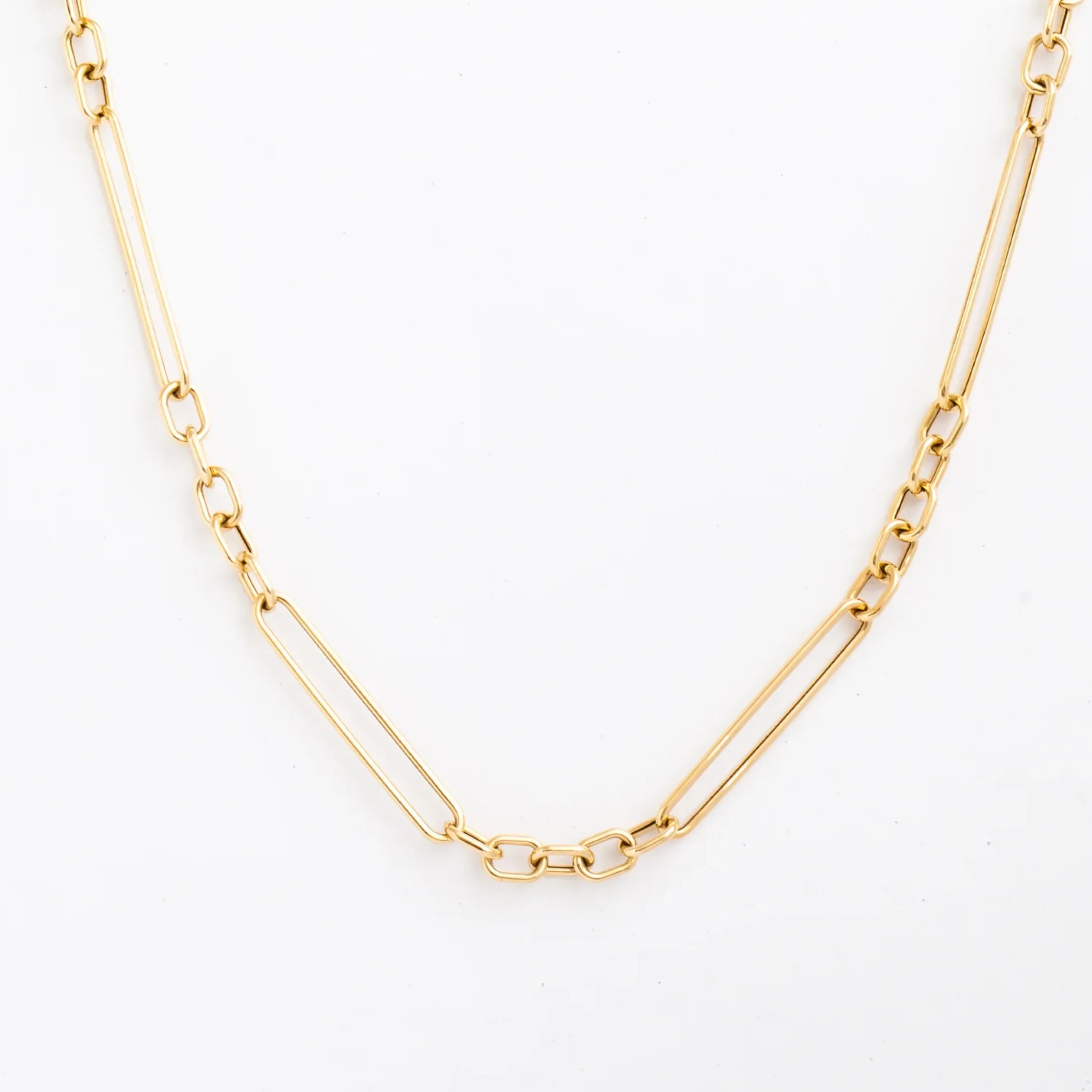 This bold gold chain featuring both paperclip and round links will be a conversation starter. It’s perfect for wearing on its own or with charms added. Dress it up or dress it down, just don’t forget it!