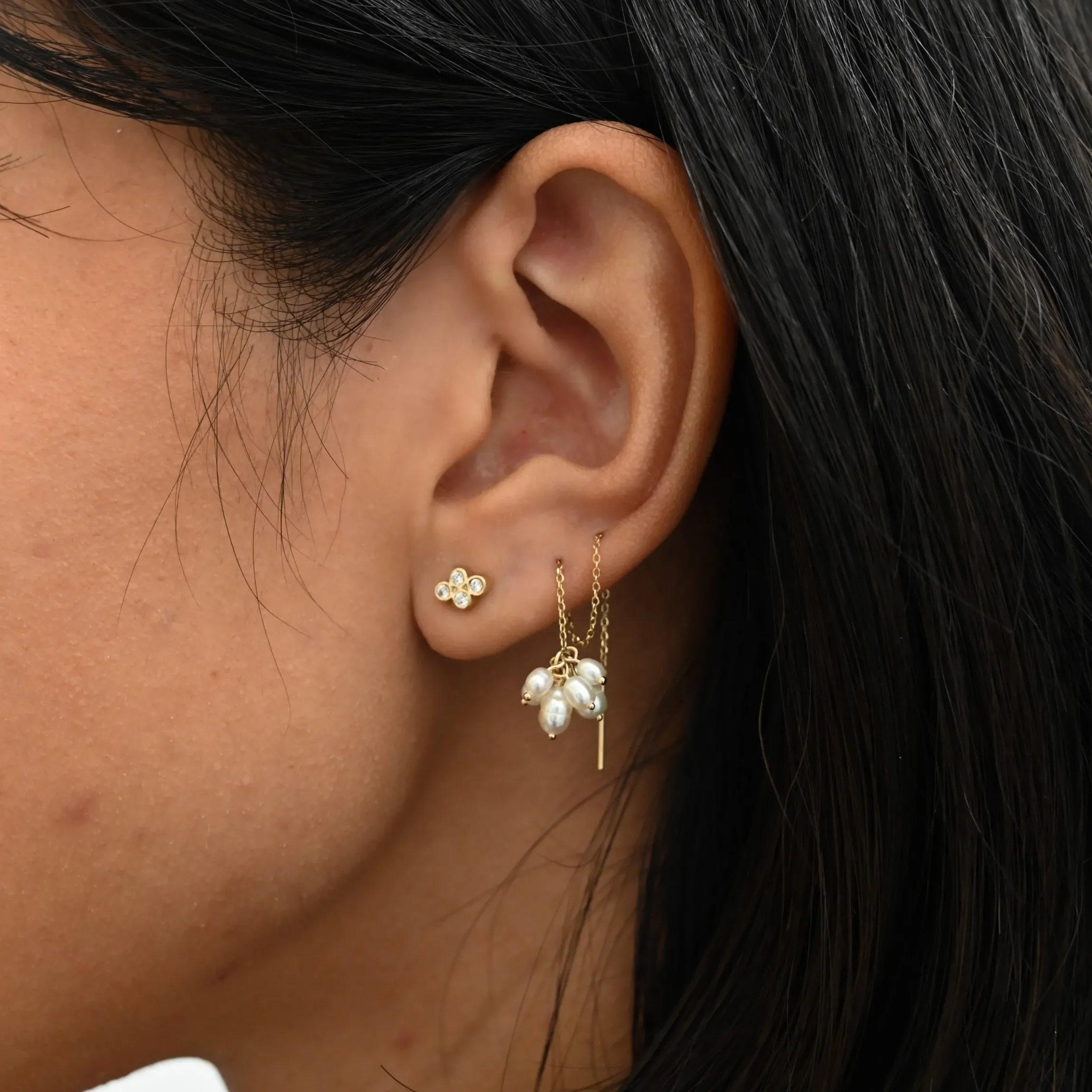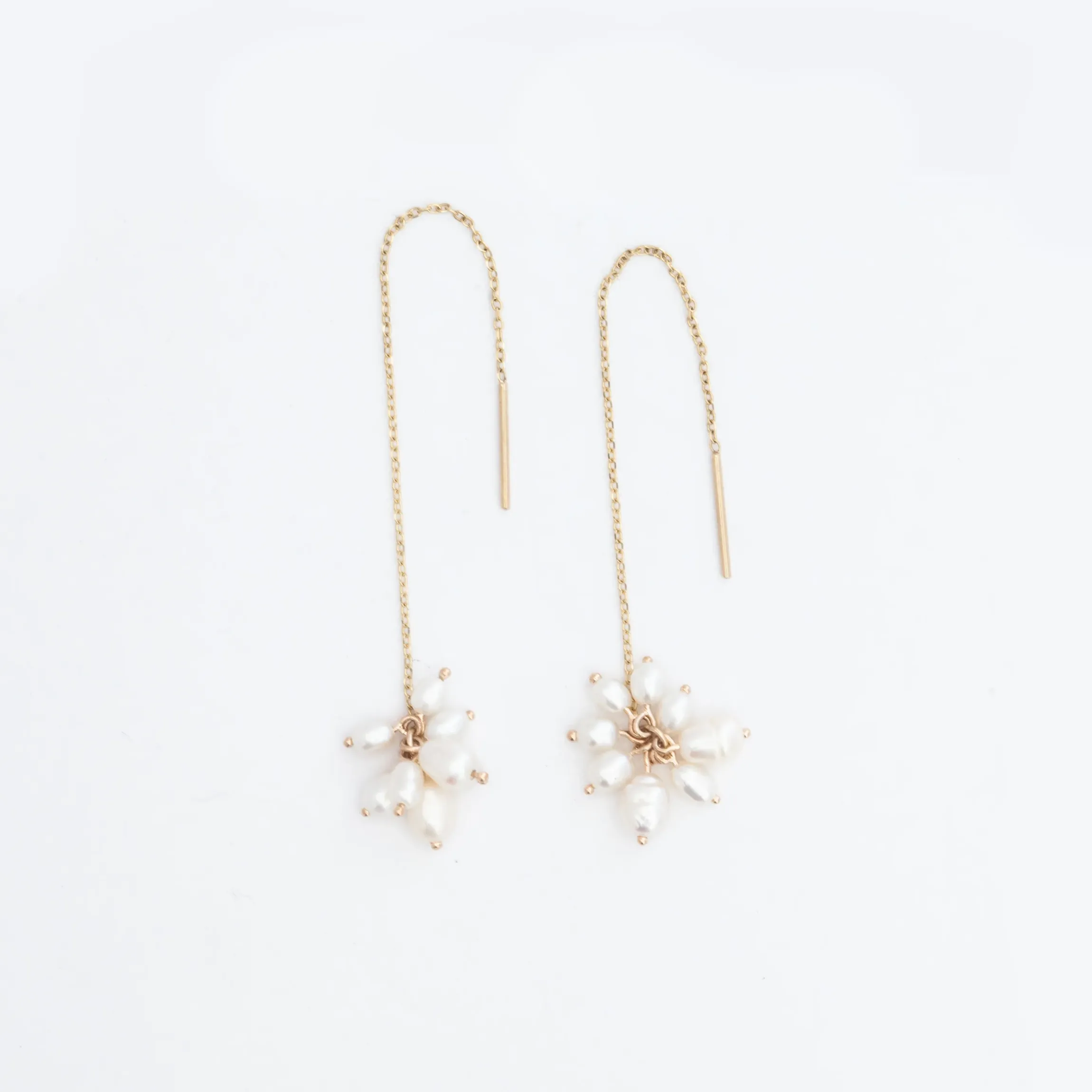 Girl with the pearl earring, eat your heart out! A cluster of luminous white pearls form an abstract “cloud” for a kinetic threader earring. A slender gold bar slips easily through the ear, letting you adjust the position of the pearls for exact styling. Artistic, organic, and quietly luxurious, this pair modernizes one of our favorite ancient gems. Made in the U.S.A.