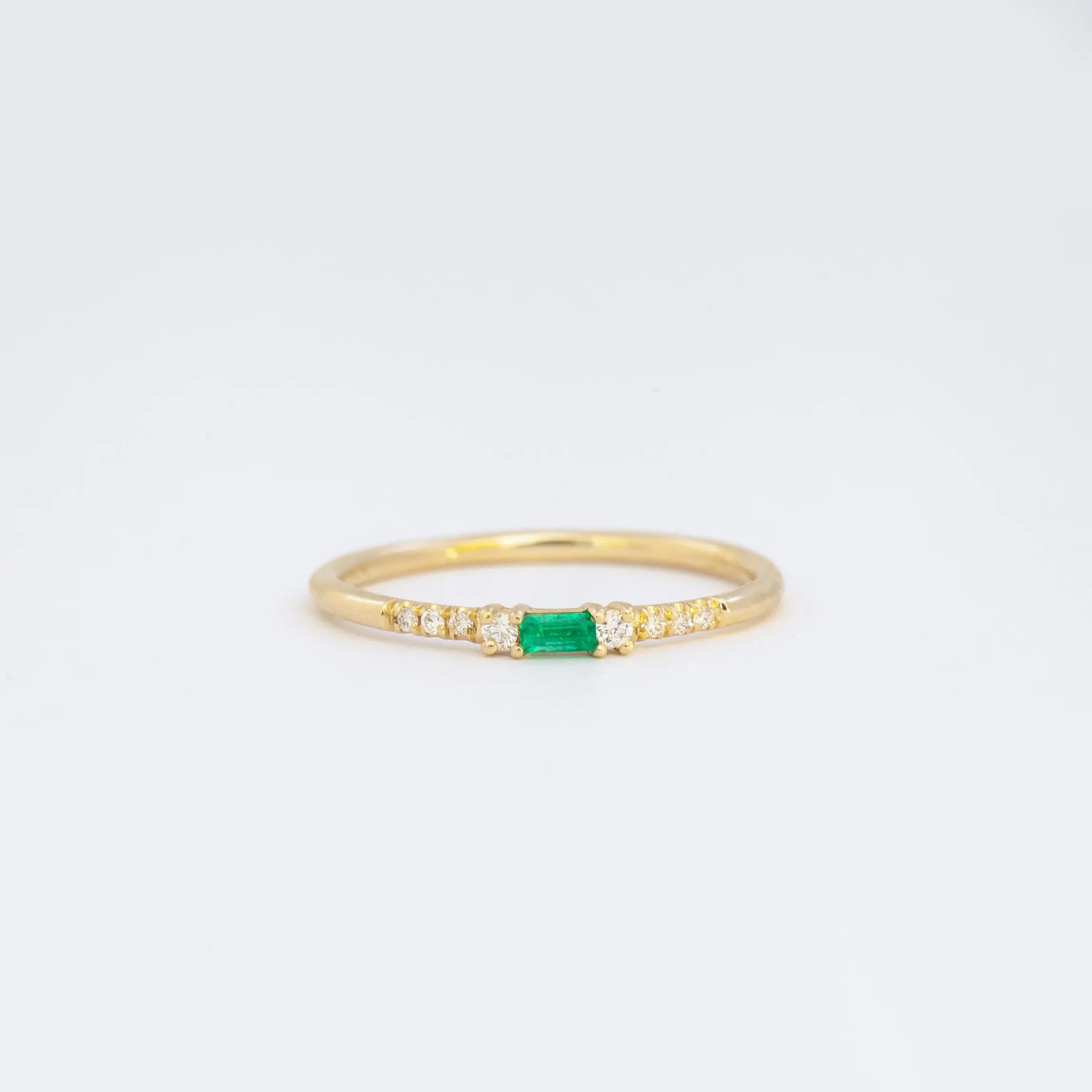 14 karat gold set with one 3 mm x 1.5 mm baguette emerald, two 1.5 mm round white diamonds, and six 1 mm round white diamonds.