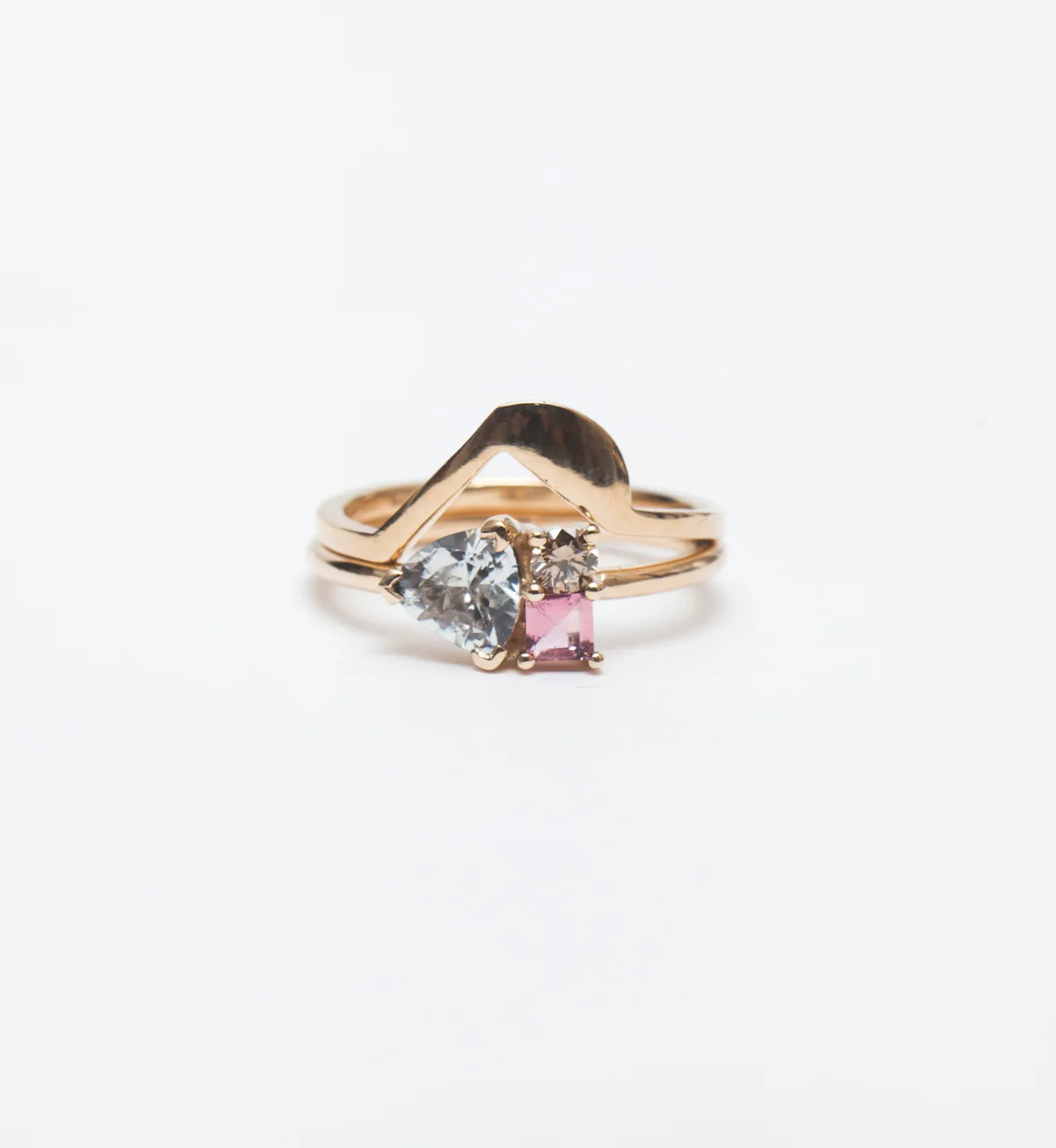 14 karat reclaimed gold with a 6 mm Sri Lankan white sapphire trillion, 3 mm Australian champagne diamond, and a recycled 3 mm pink tourmaline princess-cut.