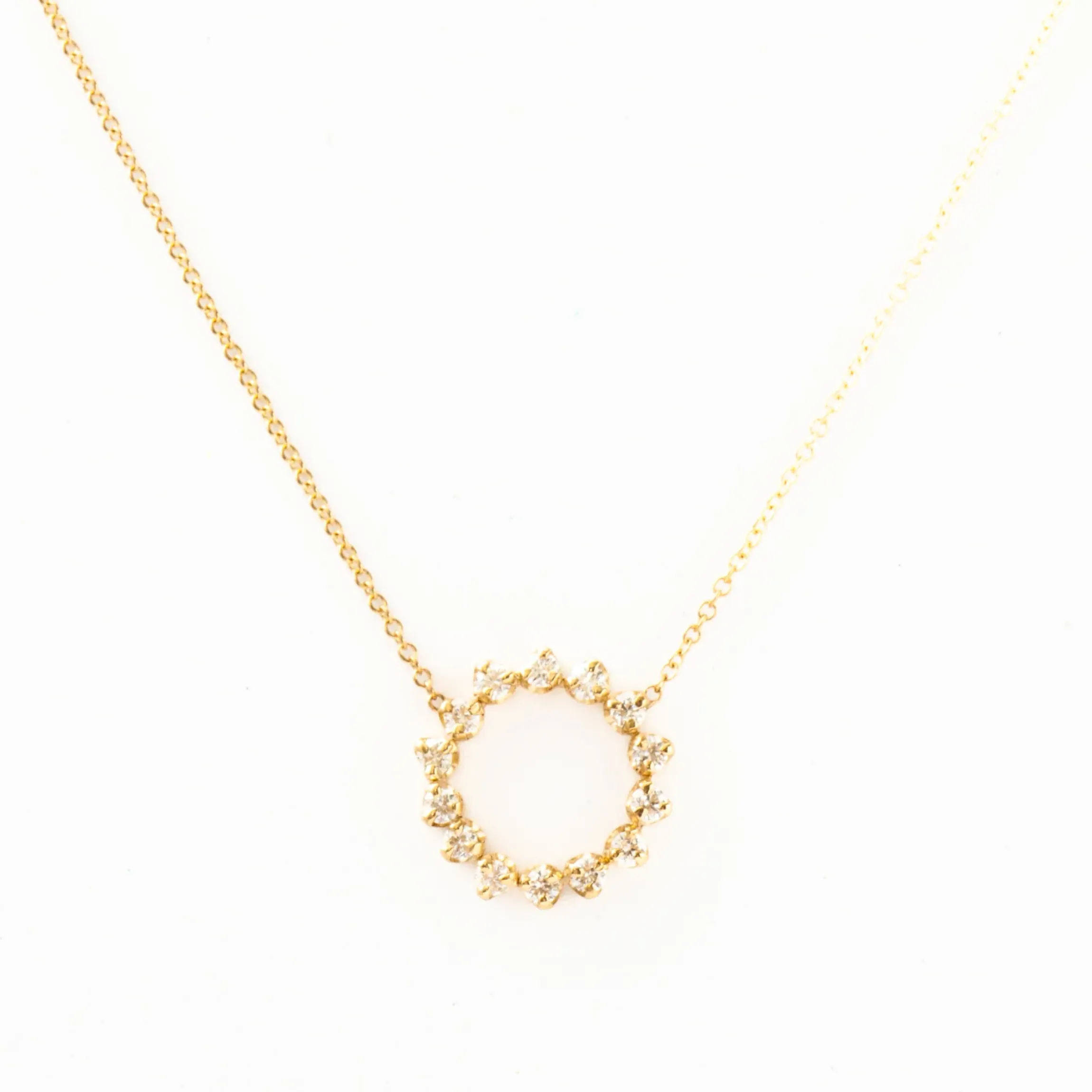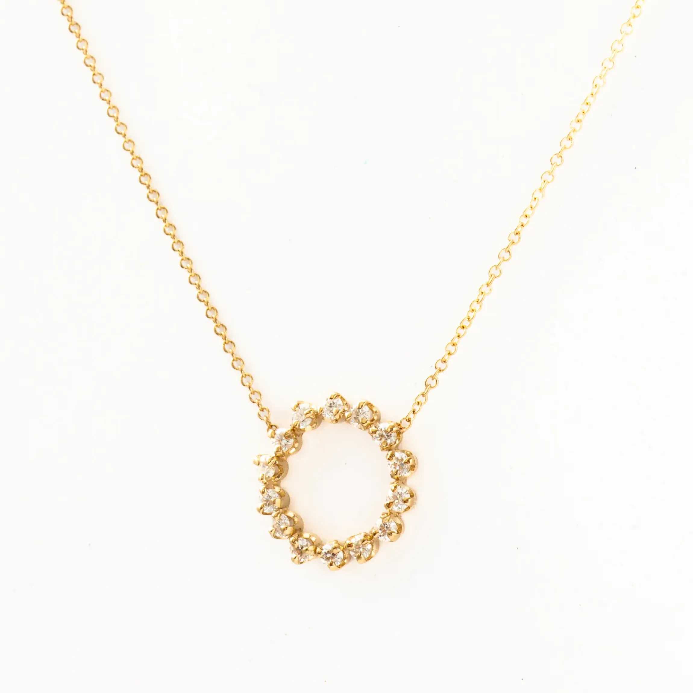 The perfect necklace for when you want to add a little sunshine and sparkle to your look is here. Along a delicate yellow gold cable chain necklace lies an open sun circle of 14 prong set round diamonds. From gorgeous negative space to a seemingly endless roundup of diamonds, the unique design of this necklace is sure to catch the eye. Made in the USA.