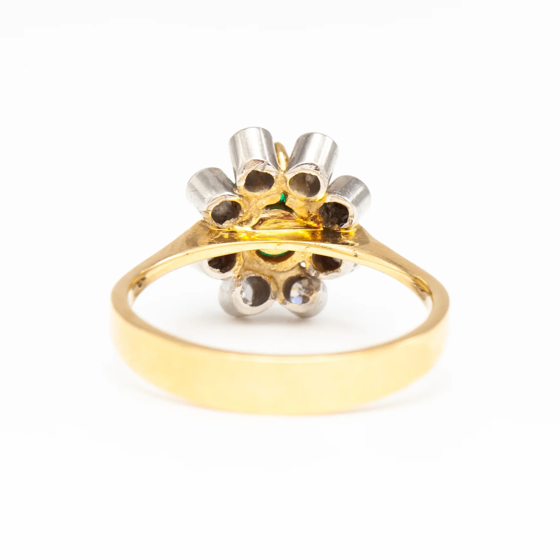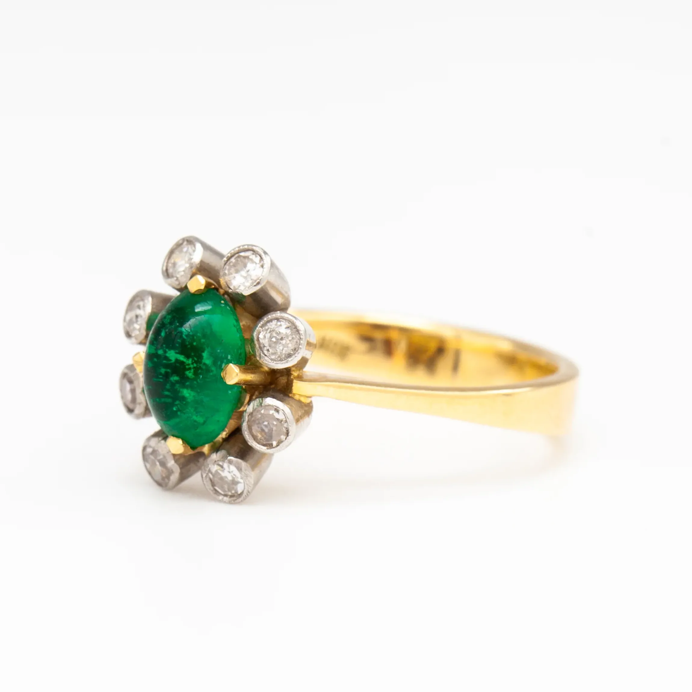 18 karat yellow and white gold with emerald cabochon u0026amp; single-cut round diamonds.