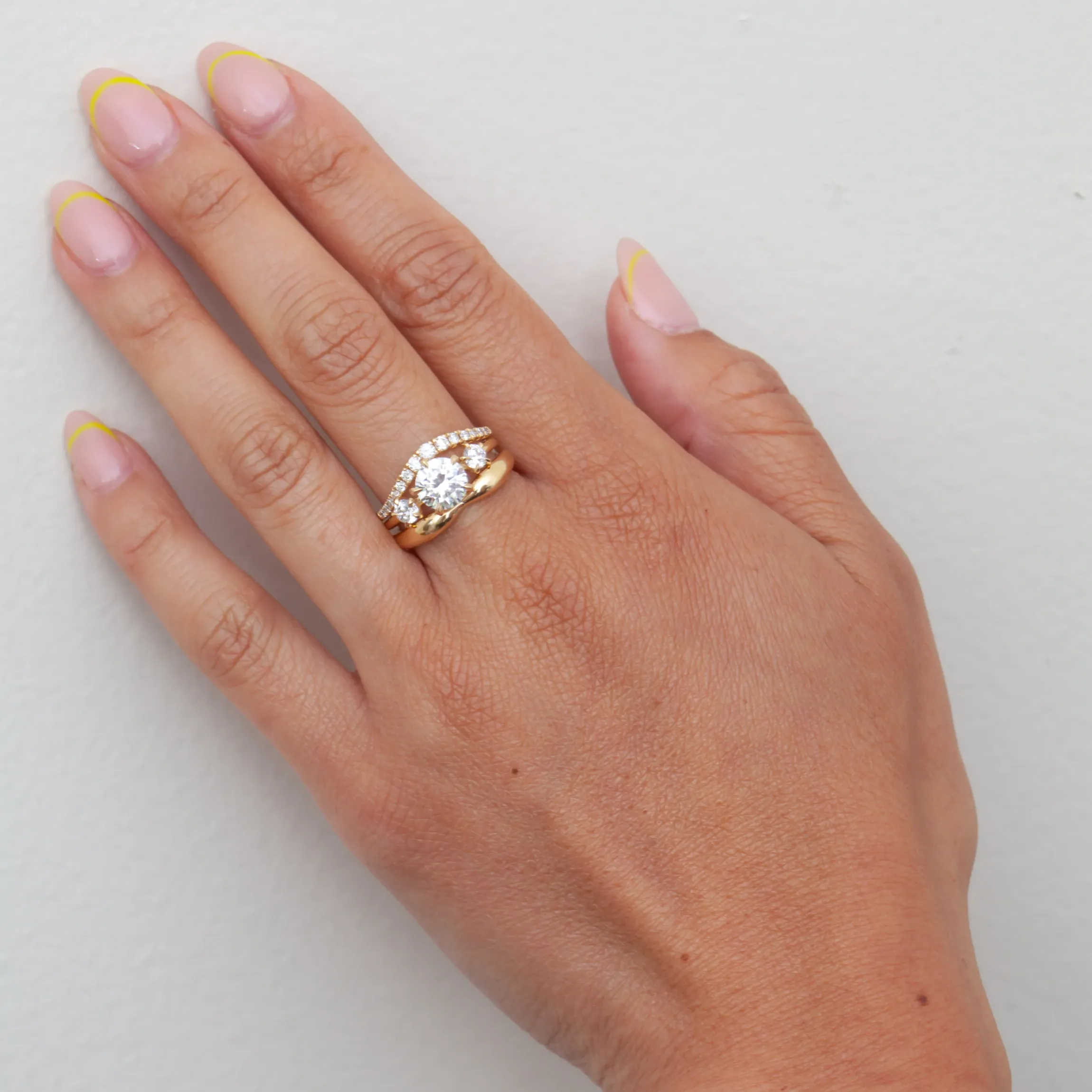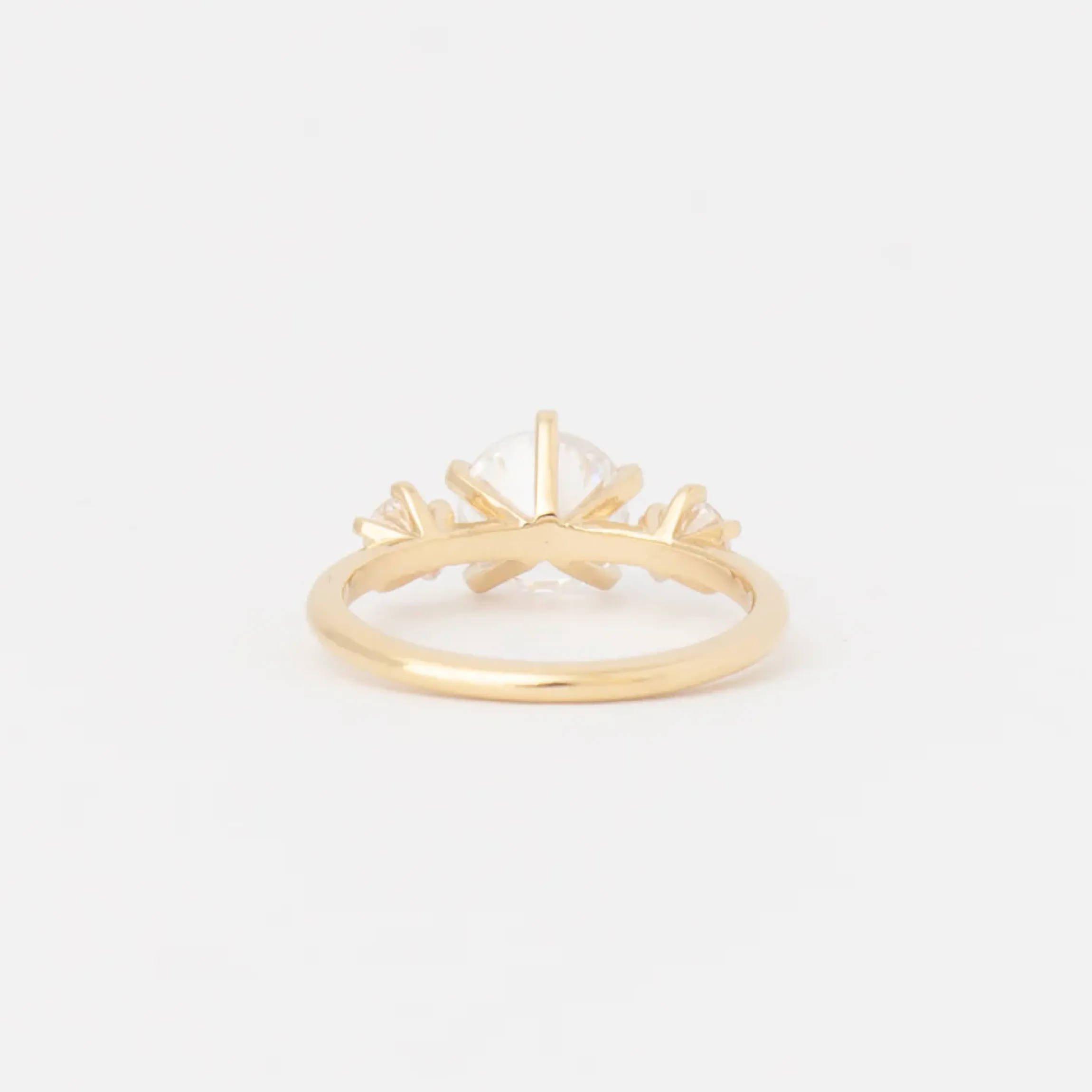 Drawing inspiration from the beloved Vault Solitaire, this new setting by The Future Fine is a classic three-stone beauty with a modern twist. With a slightly exaggerated space between the center stone and the round diamonds that flank it, this ring spreads across the finger for maximum impact while retaining a uniquely dainty feel. Each stone is cradled by five prongs, providing subtle asymmetry that makes it a dream to ponder and stack.