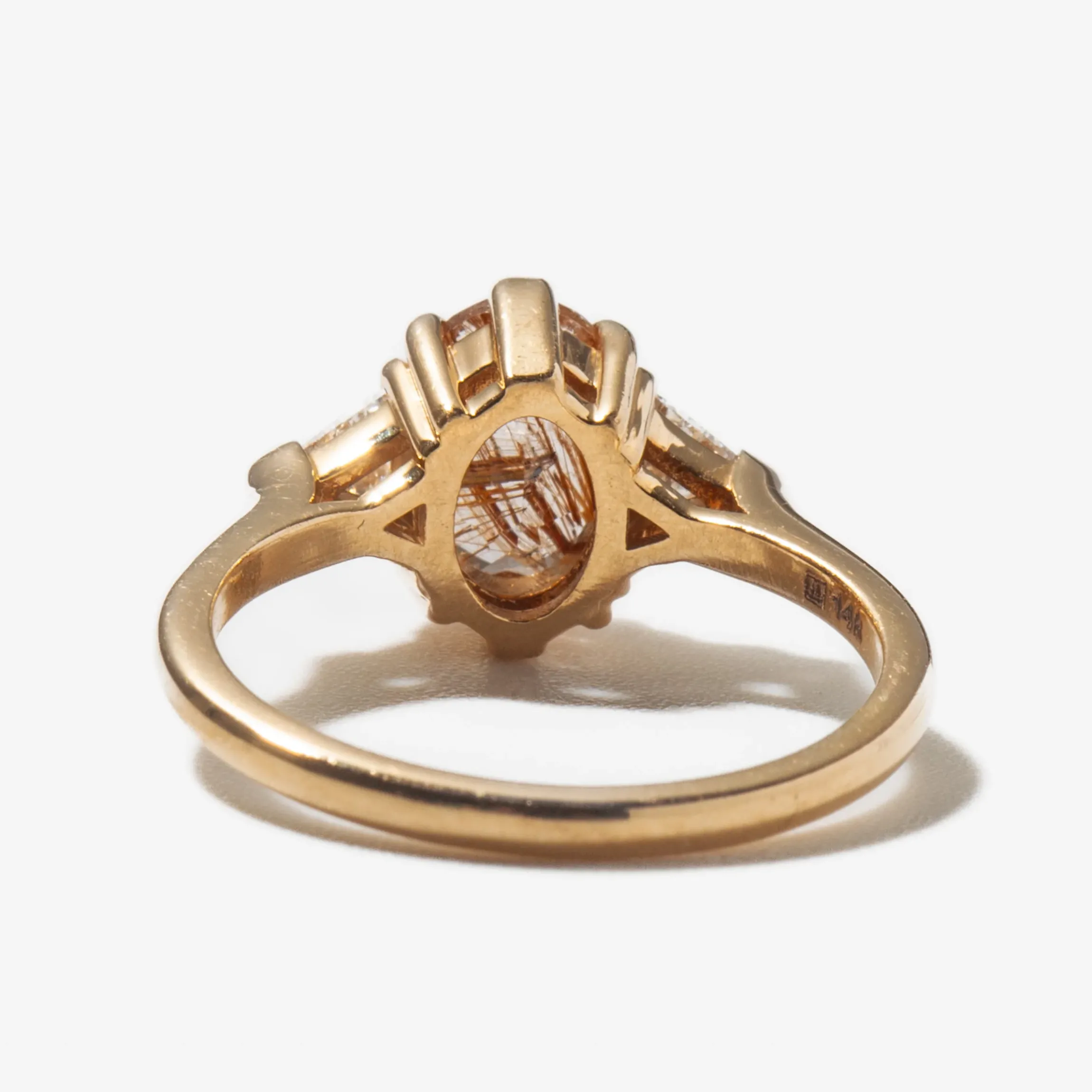 14 karat yellow gold set with a 8x6mm rutilated quartz oval center and two white diamond triangles totaling 0.14 carat.