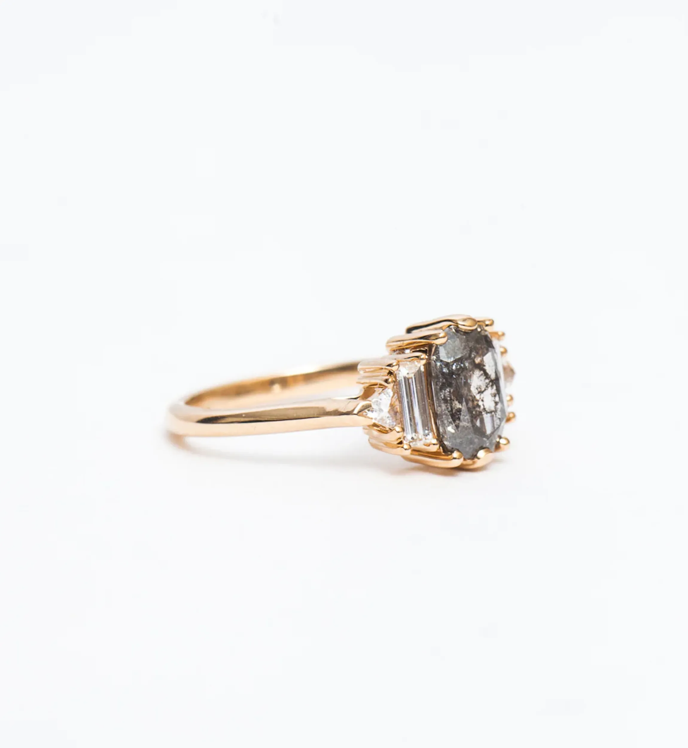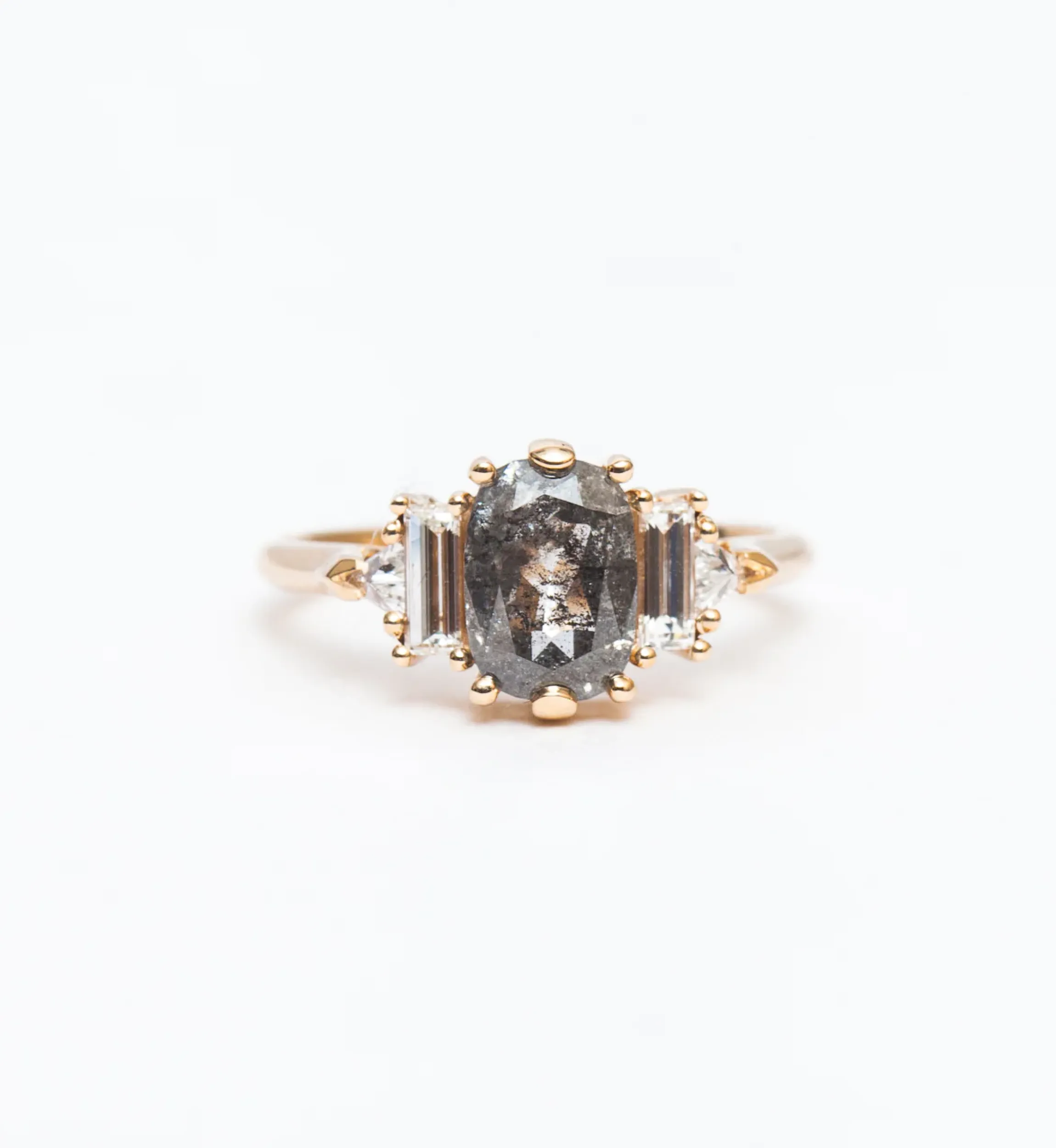 14 karat gold with a 1.43 carat cushion salt u0026amp; pepper diamond, two baguette white diamonds, and two trillion white diamonds totaling 0.46 carat.