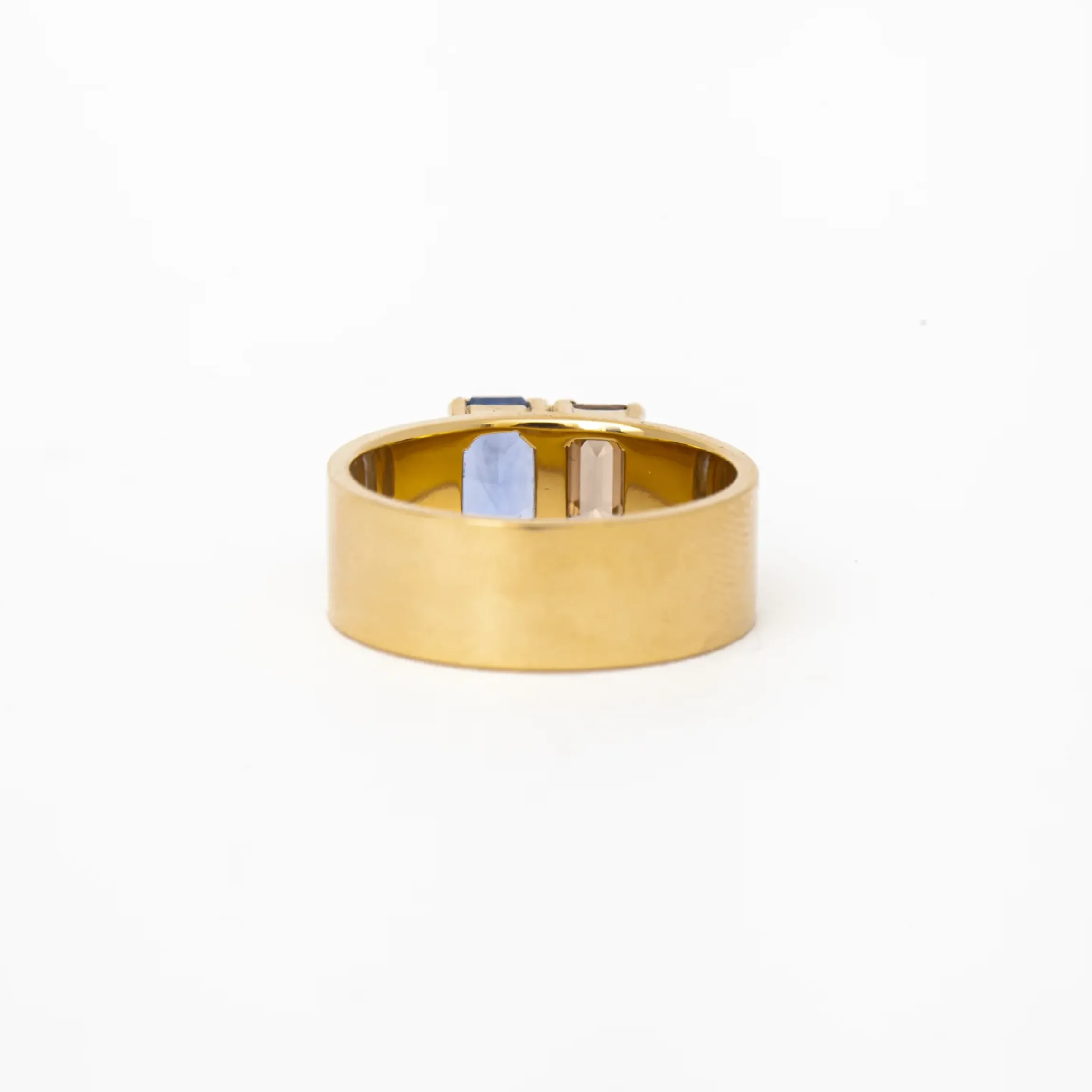 Bold and beautiful, this one of a kind Menhir ring features a blue sapphire and a Sri Lanka champagne diamond. Two parts make a whole in this beautiful ring. The two colorful, emerald cut stones are set on a flat gold band the same width, creating a classic but monumental ring. Stack it with WWAKE’s organic, contoured rings to break the rules and make your own traditions. Made in the U.S.A.