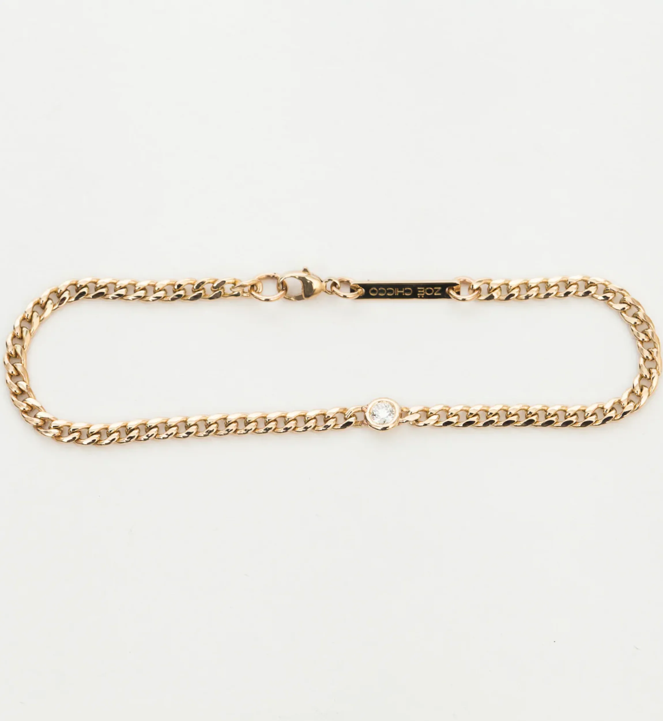 A single bezel-set diamond on this chain bracelet is worked seamlessly into its dainty (but not too dainty) links. Discovering the round gem’s unmistakable sparkle amongst the textured chain is half the fun! Layer alongside smooth cuffs or even tinier chains for two different, but equally gorgeous options. Finished with a hallmarked logo plate and lobster clasp. Made in the U.S.A.