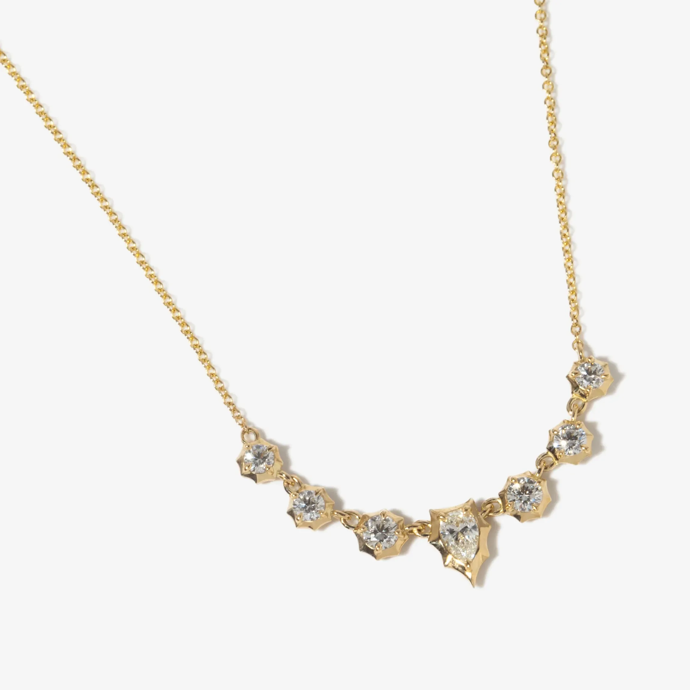 Classic tennis necklace styling meets Jade Trau’s distinctive eye for shape in this dazzling design. Six round brilliant diamonds frame a single pear diamond. The gleaming golden frames accentuate each diamond, making this necklace so much more than the sum of its parts. Wear it with heavy chains for a perfect balance between heavy metal and high shine. Made in New York.