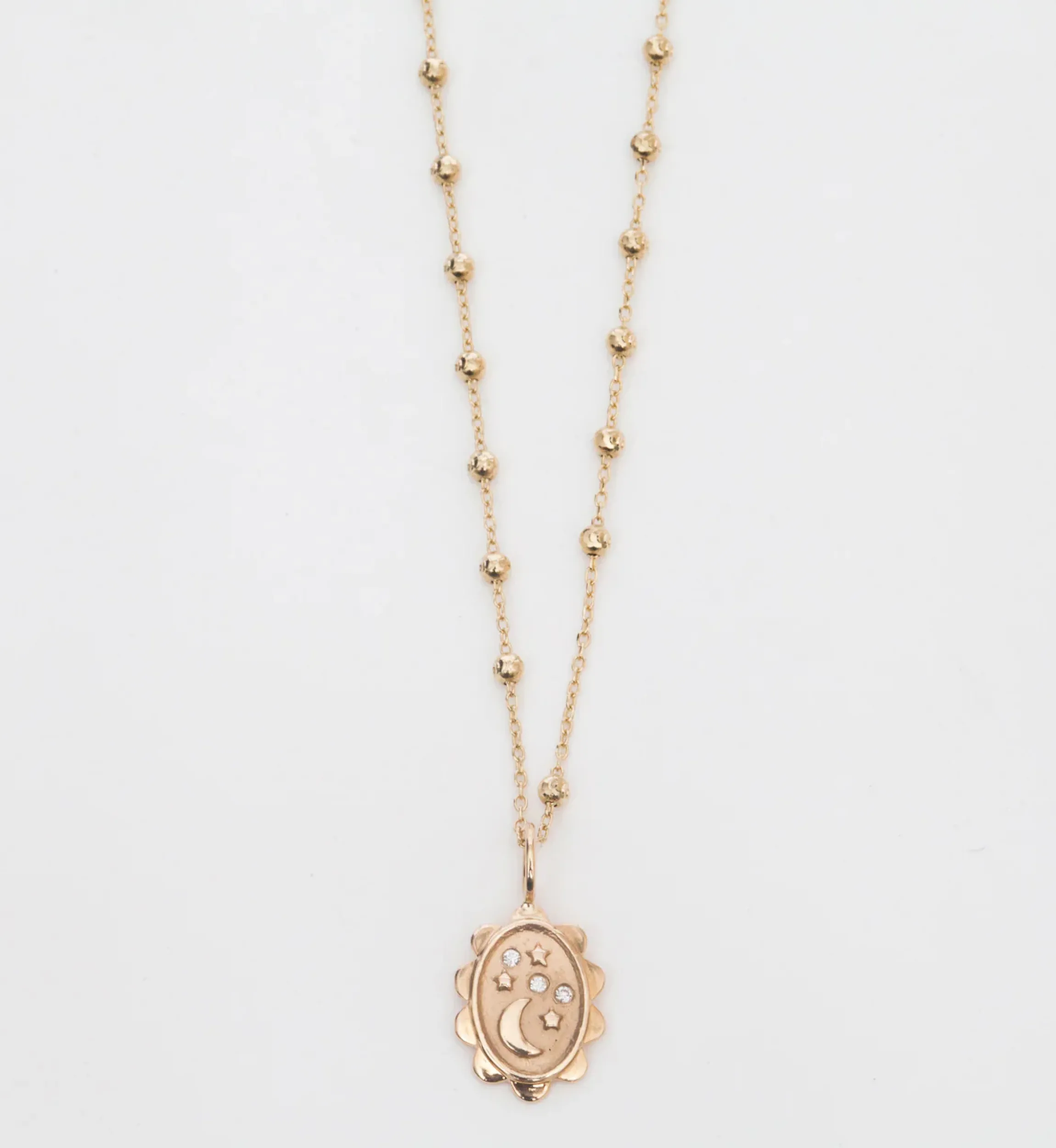 The twinkling night sky is captured in solid gold on this elegant oval pendant. Cast in solid gold and finished with a scalloped frame, this style features a crescent moon, stars, and scattered white diamonds. We love how its detailed design and subtle sparkle add the perfect dash of romance to everyday looks. Made in the U.S.A.