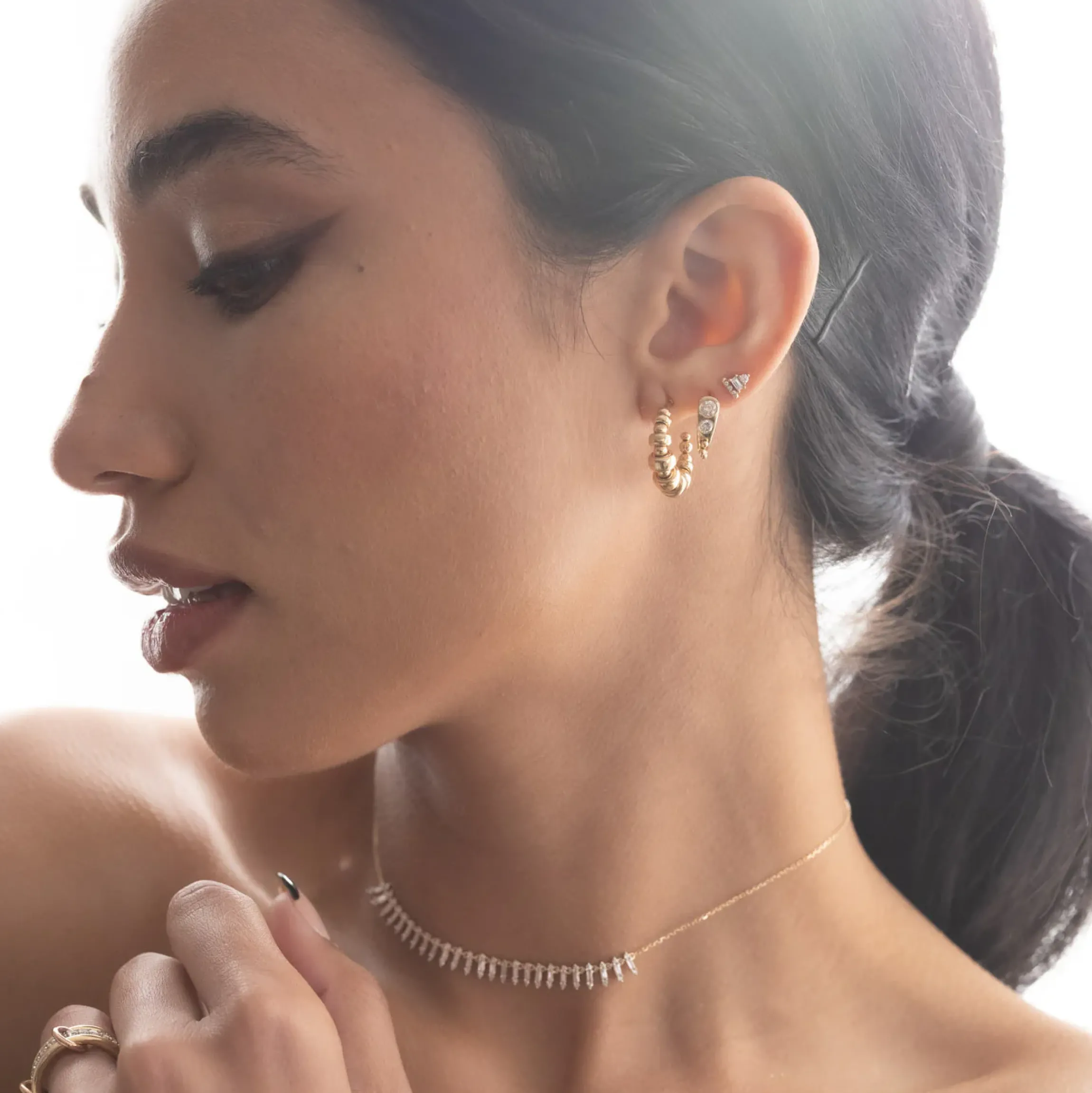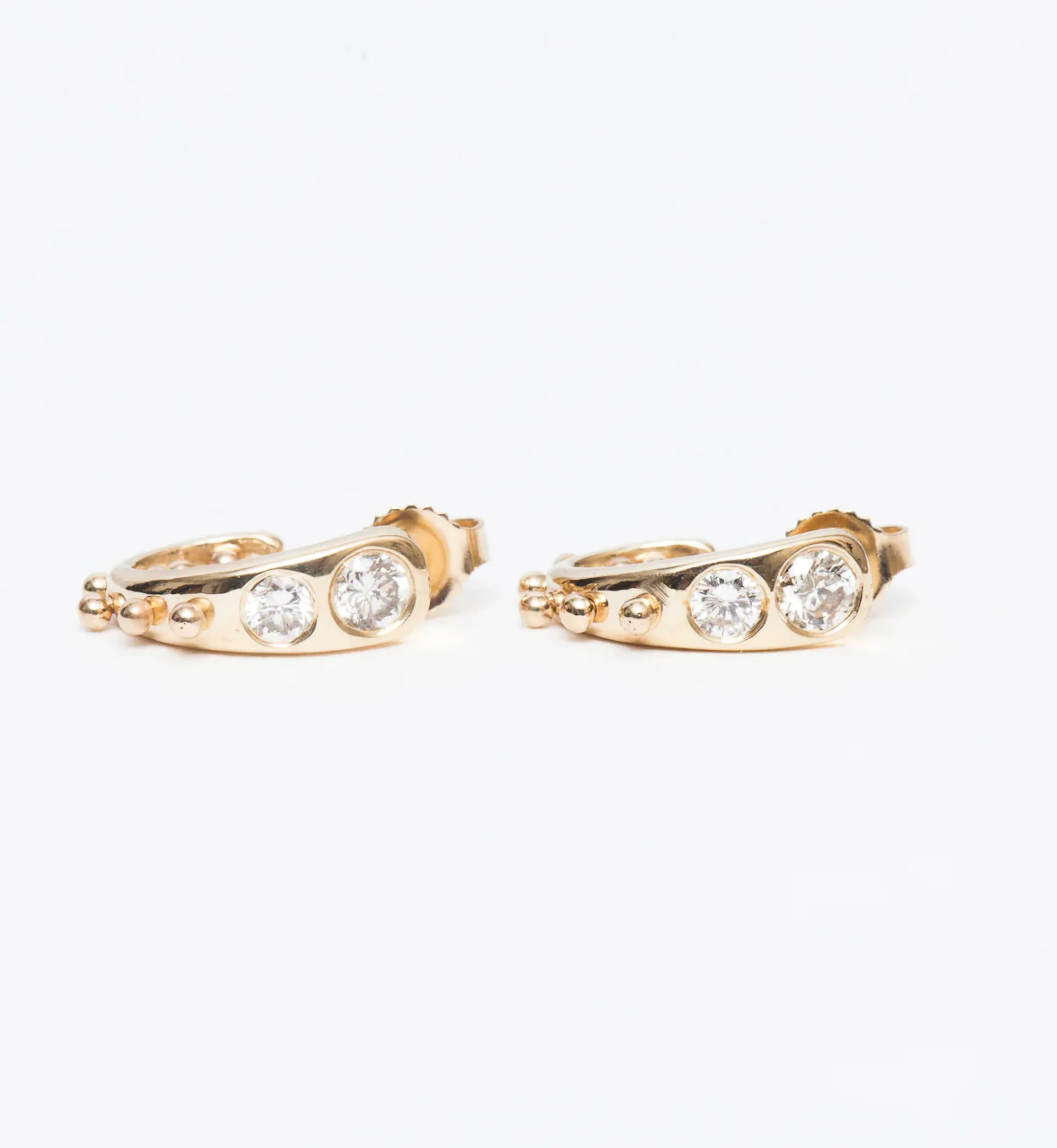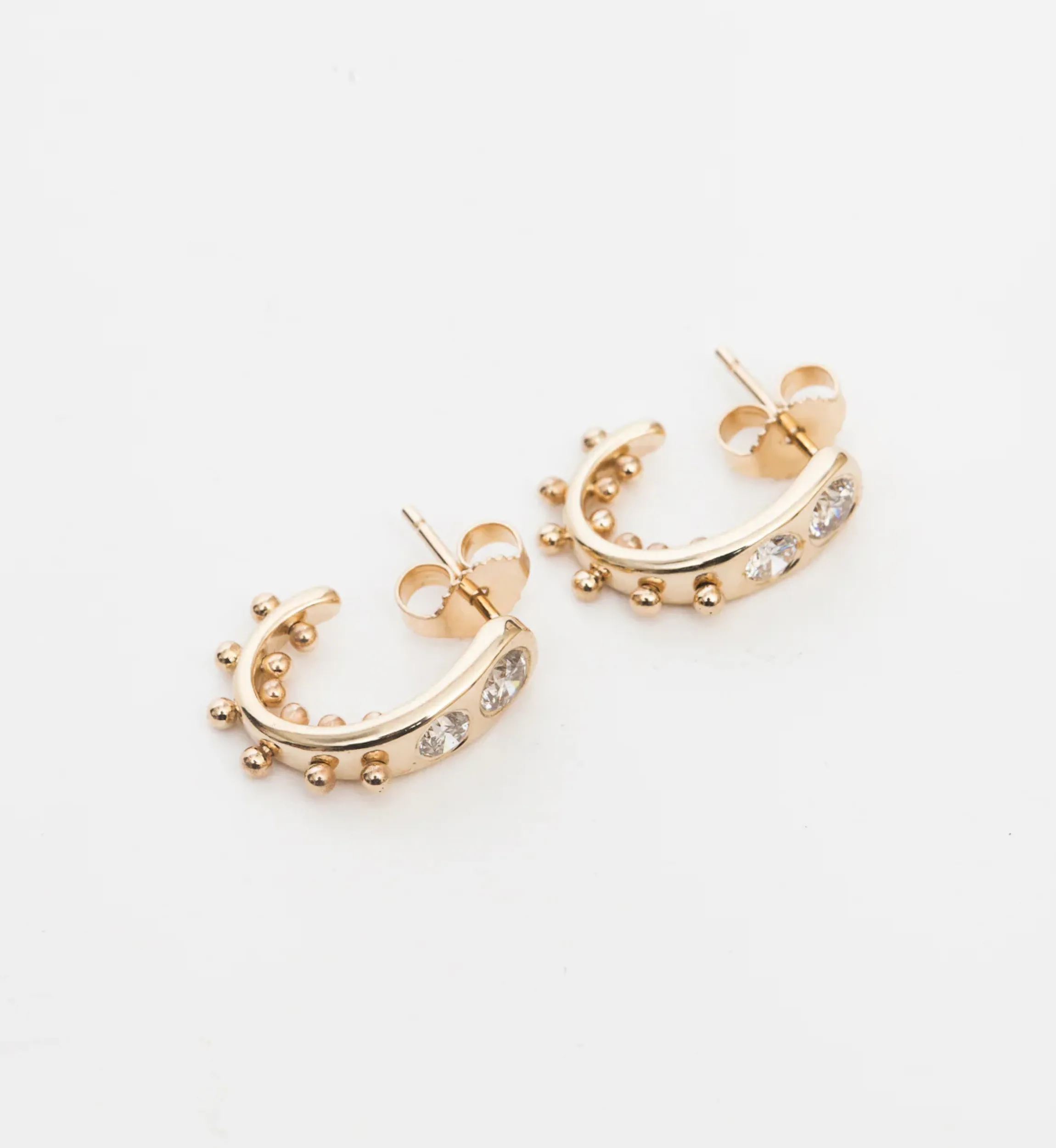 Worn like a stud, fitted like a hoop, and designed unlike anything else; these earrings combine classic elements into a new, sculptural form. Dazzling diamonds are flush set into the earring’s face, tapering downwards before seeming to transform into golden beads. The artistic design complements the petite shape perfectly for a style that’s as easy to wear as it is lovely to contemplate. Made in the U.S.A.