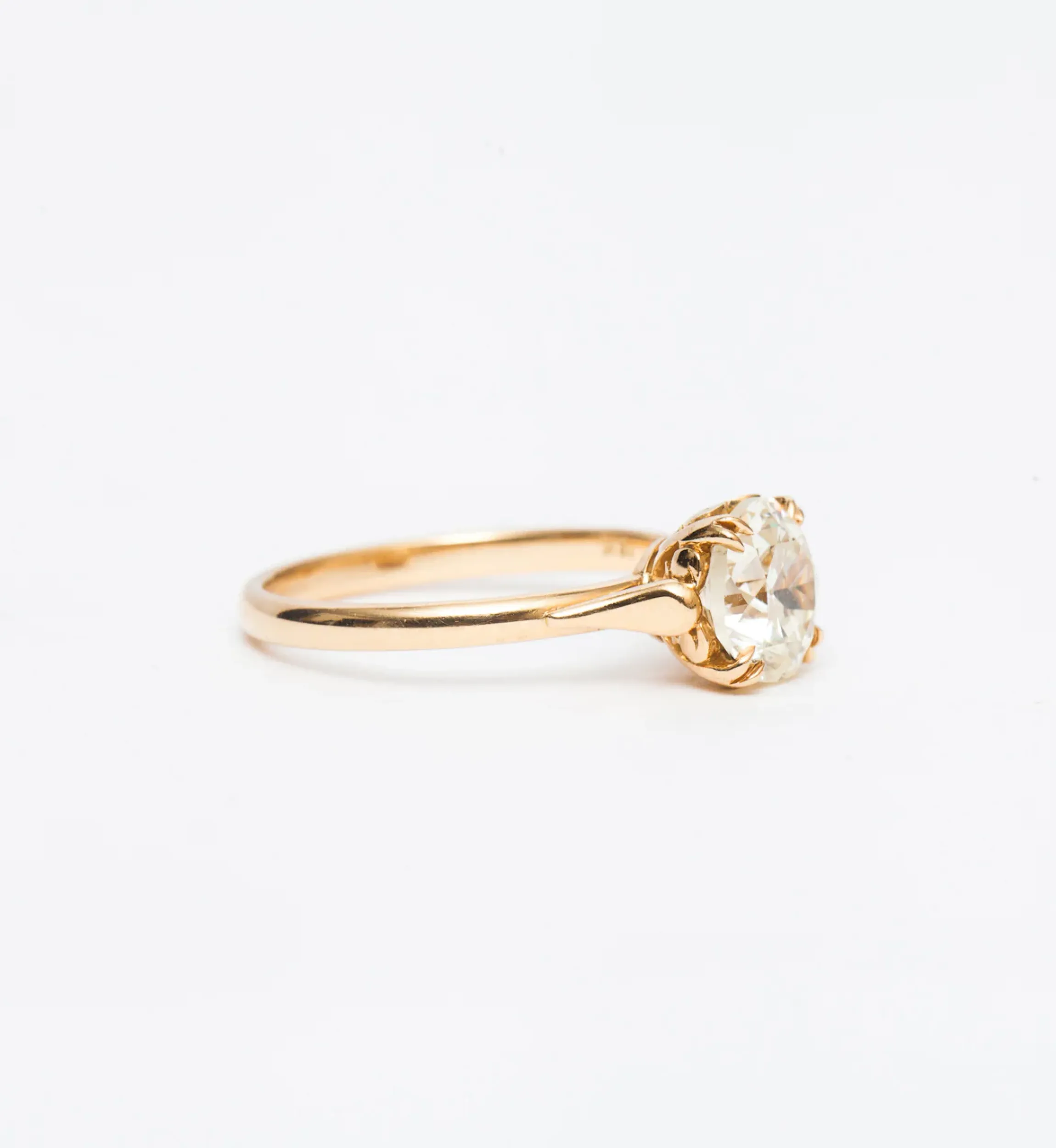 Elegant, old-world charm makes the antique diamond at the center of this solitaire ring impossible to miss. Four double-prongs frame a delicate, floral-inspired gallery while polished teardrop shoulders draw the eye down to the simple band. The streamlined look gives way to lavish detailing when viewed from the side. Pair it with a diamond band for the fullest sparkle possible. Made in the U.S.A.