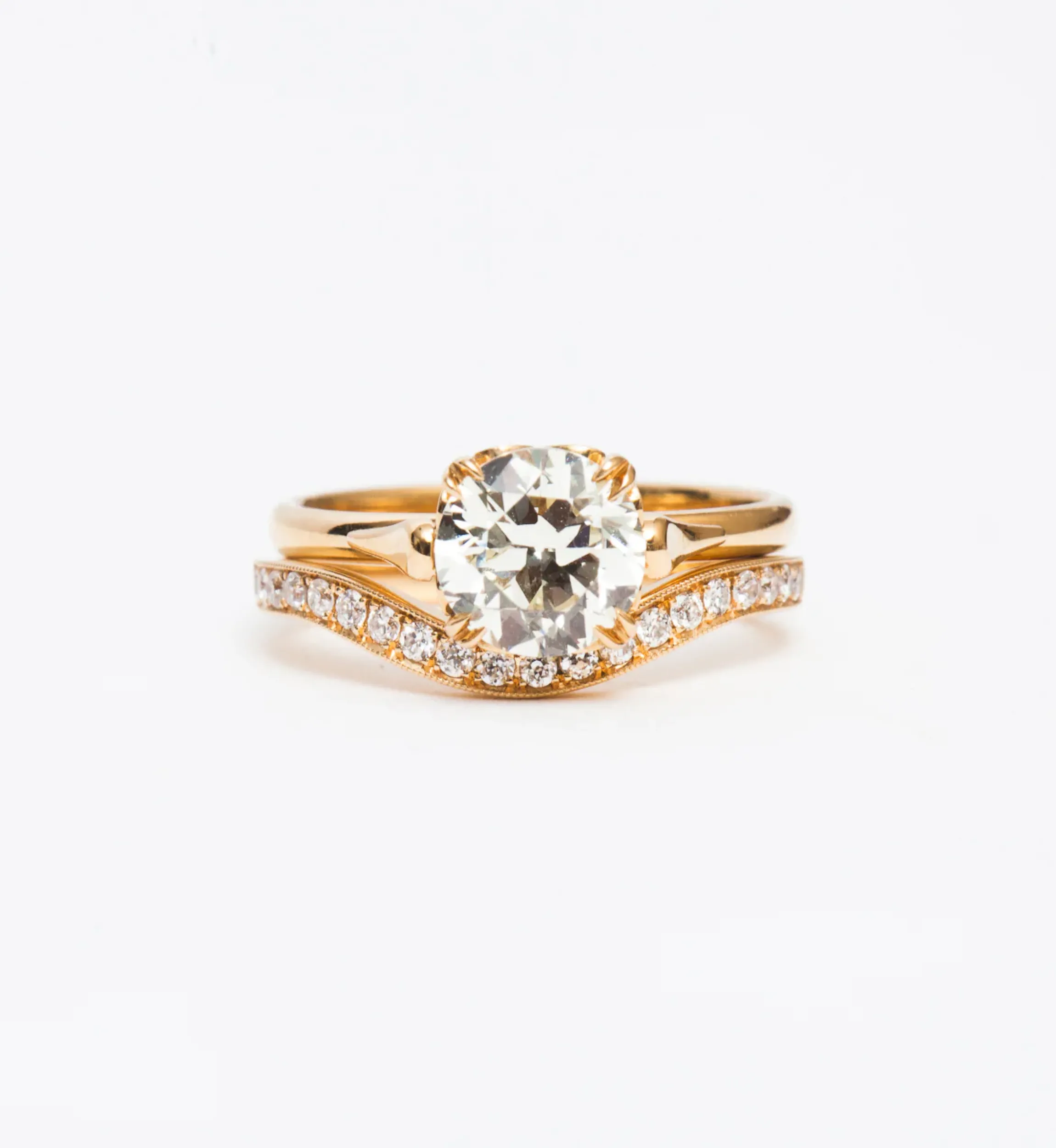 18 karat gold set with a 1.57 carat Old European round white diamond center (N color, VS clarity).