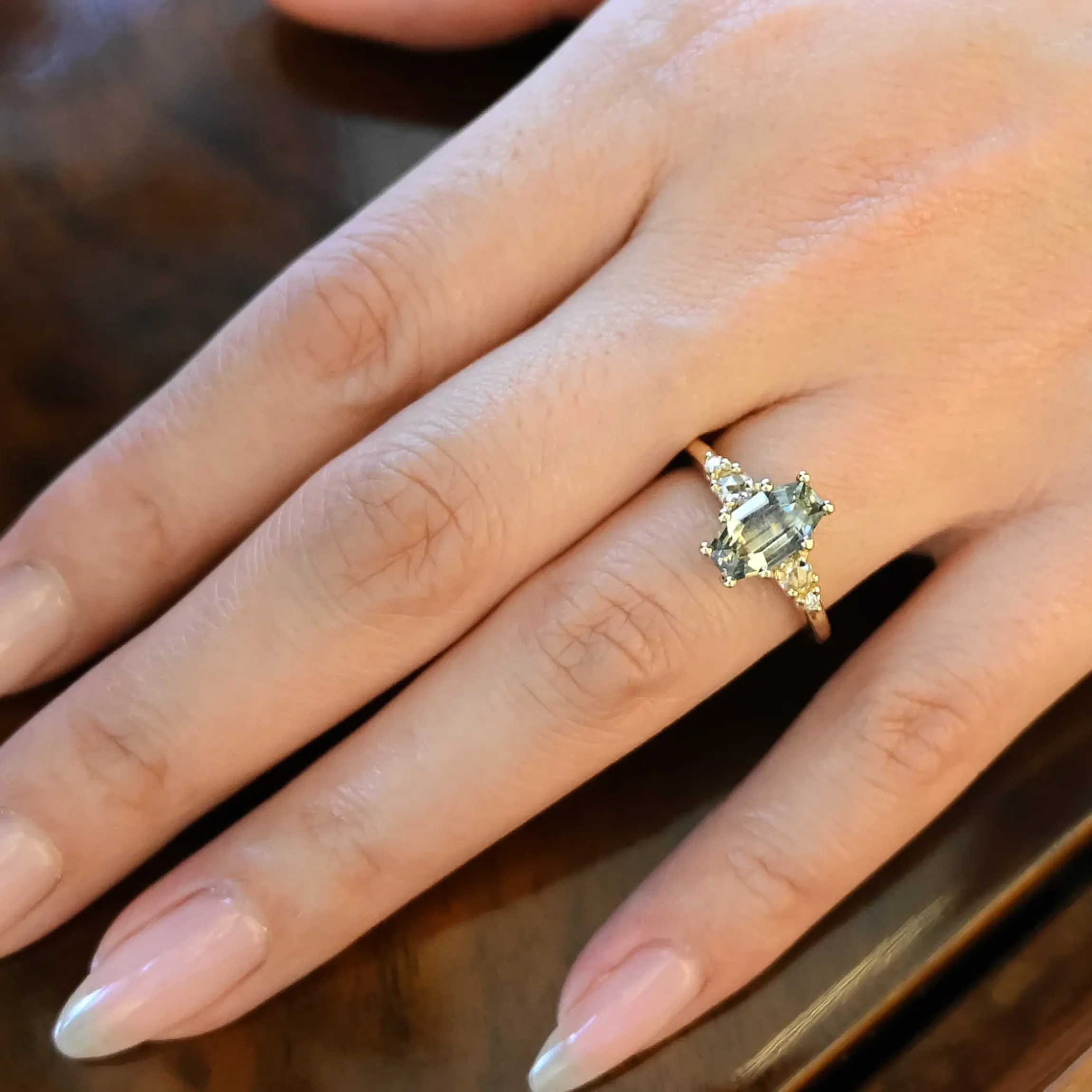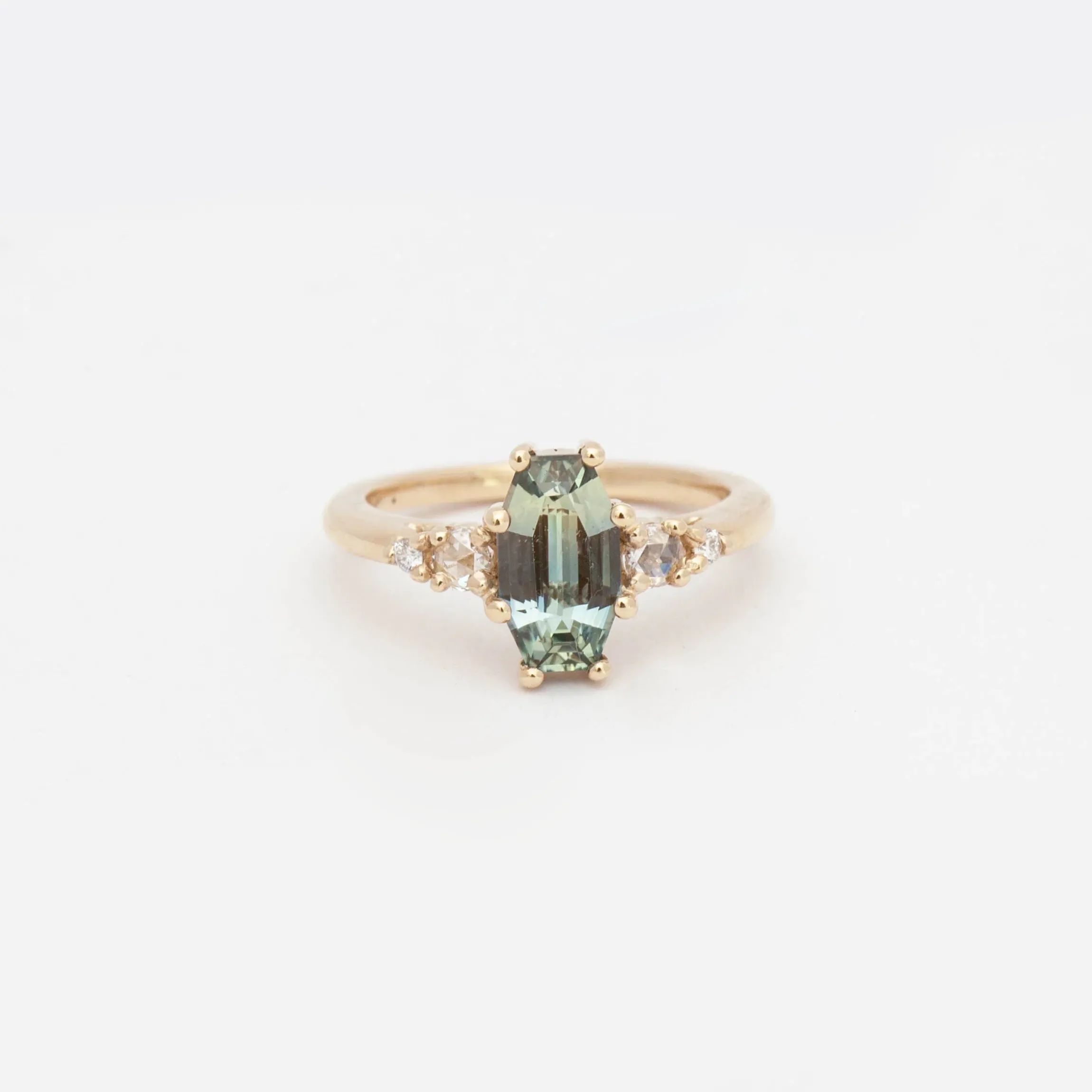 14 karat gold set with a 1.68 carat step-cut octagonal parti-colored Malagasy sapphire center, two rose-cut round white diamonds, and two brilliant-cut round white diamonds totaling an additional 0.14 carat.