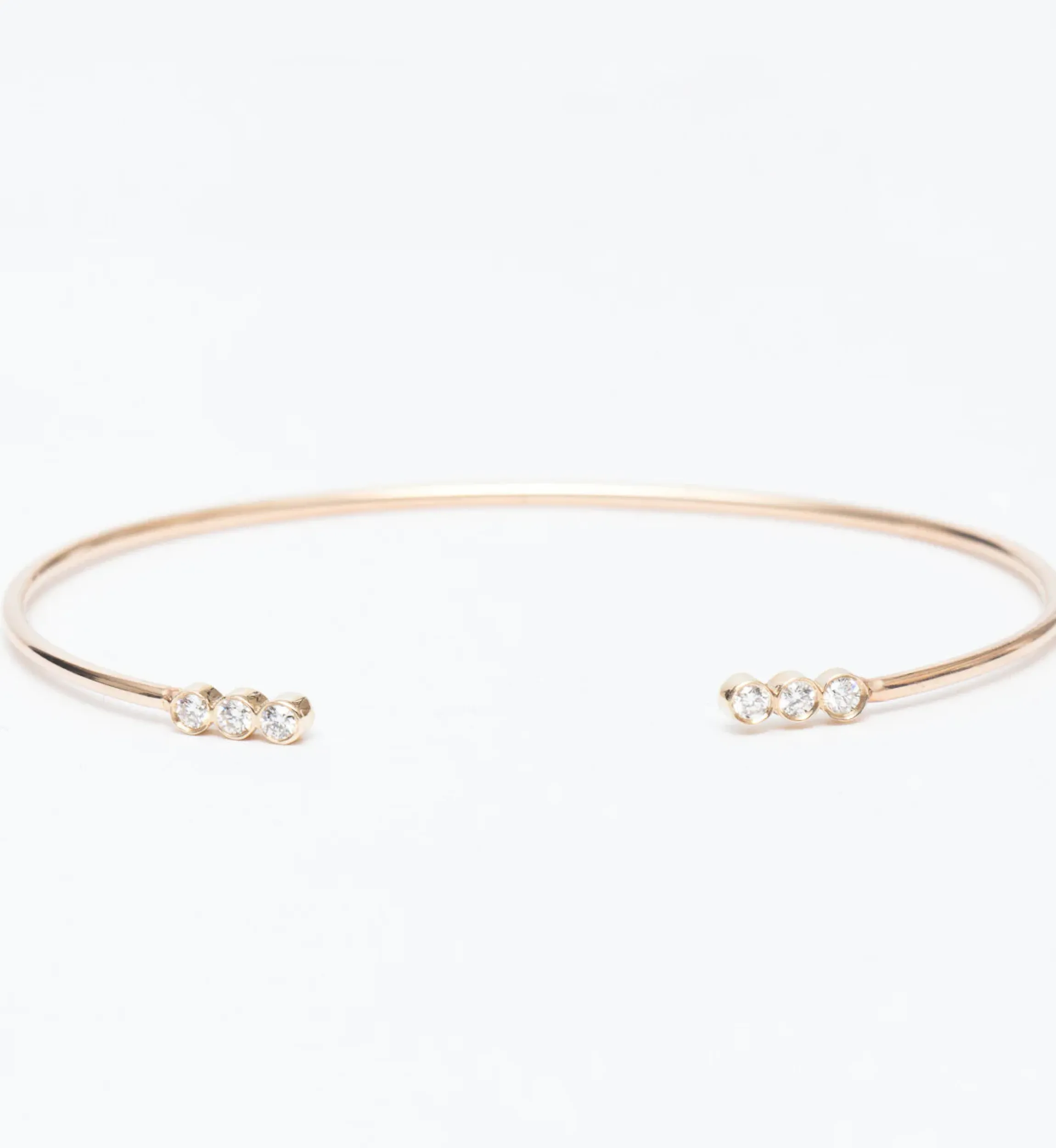 Matched trios of round white diamonds sit at each end of this svelte cuff bracelet for a dazzling accent that feels like you’re weighs almost nothing at all. Hand-drawn wire flexes gently for easy wear, slipping on your wrist and staying put all day long. Incredibly fine bezels securely hold each diamond in place without distracting from their elegant sparkle. Stack it with other wire cuffs to cover your wrist with sleek lines of gold punctuated with bright gemstones. Made in the U.S.A.