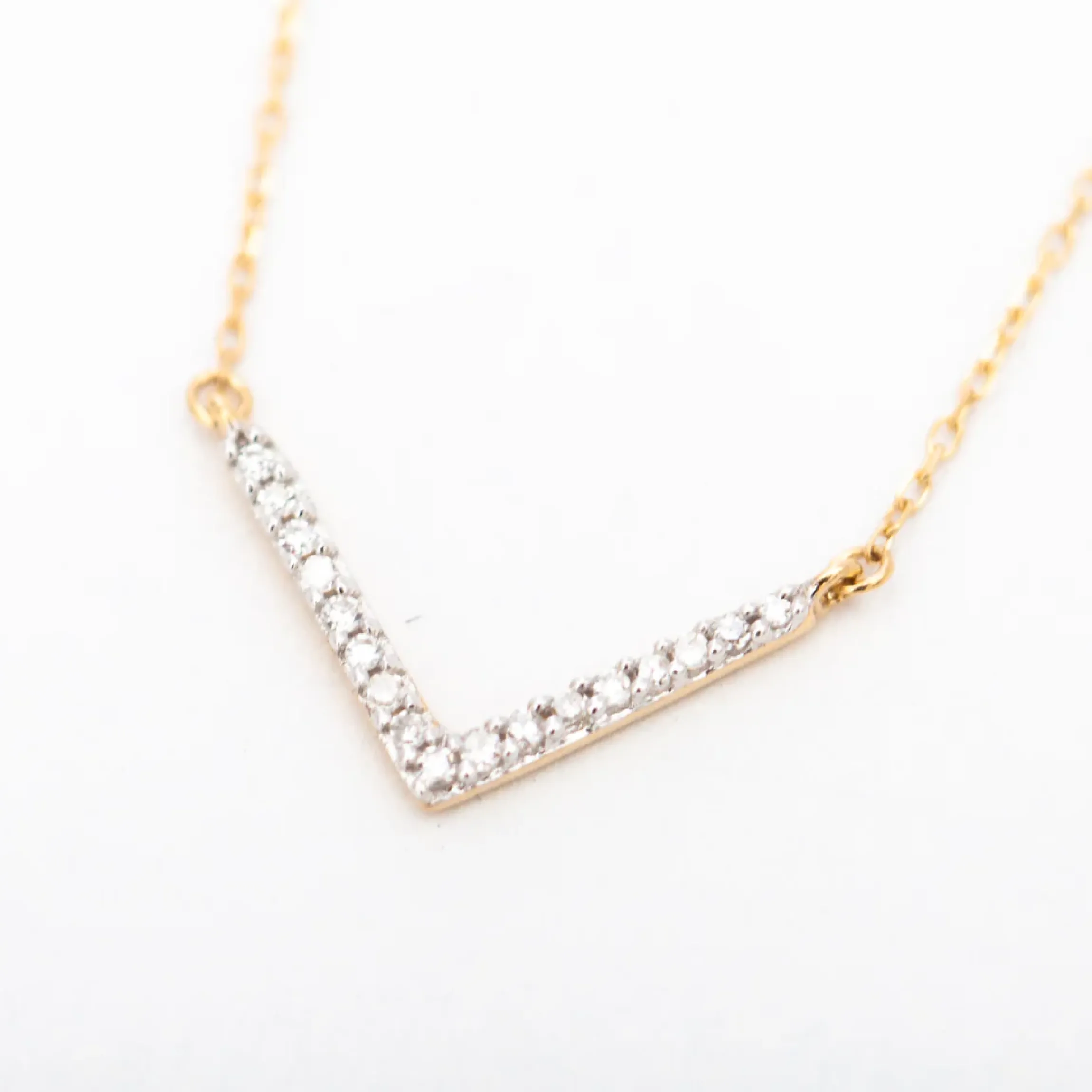 Chain adjusts between 15″ and 16″ long. Pendant “V” measures approximately 15 mm wide.