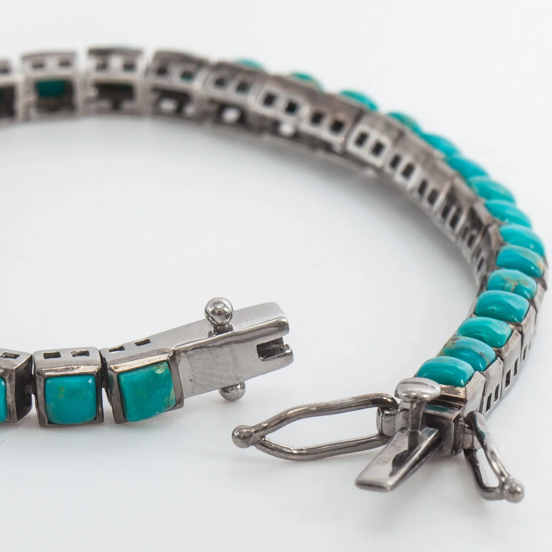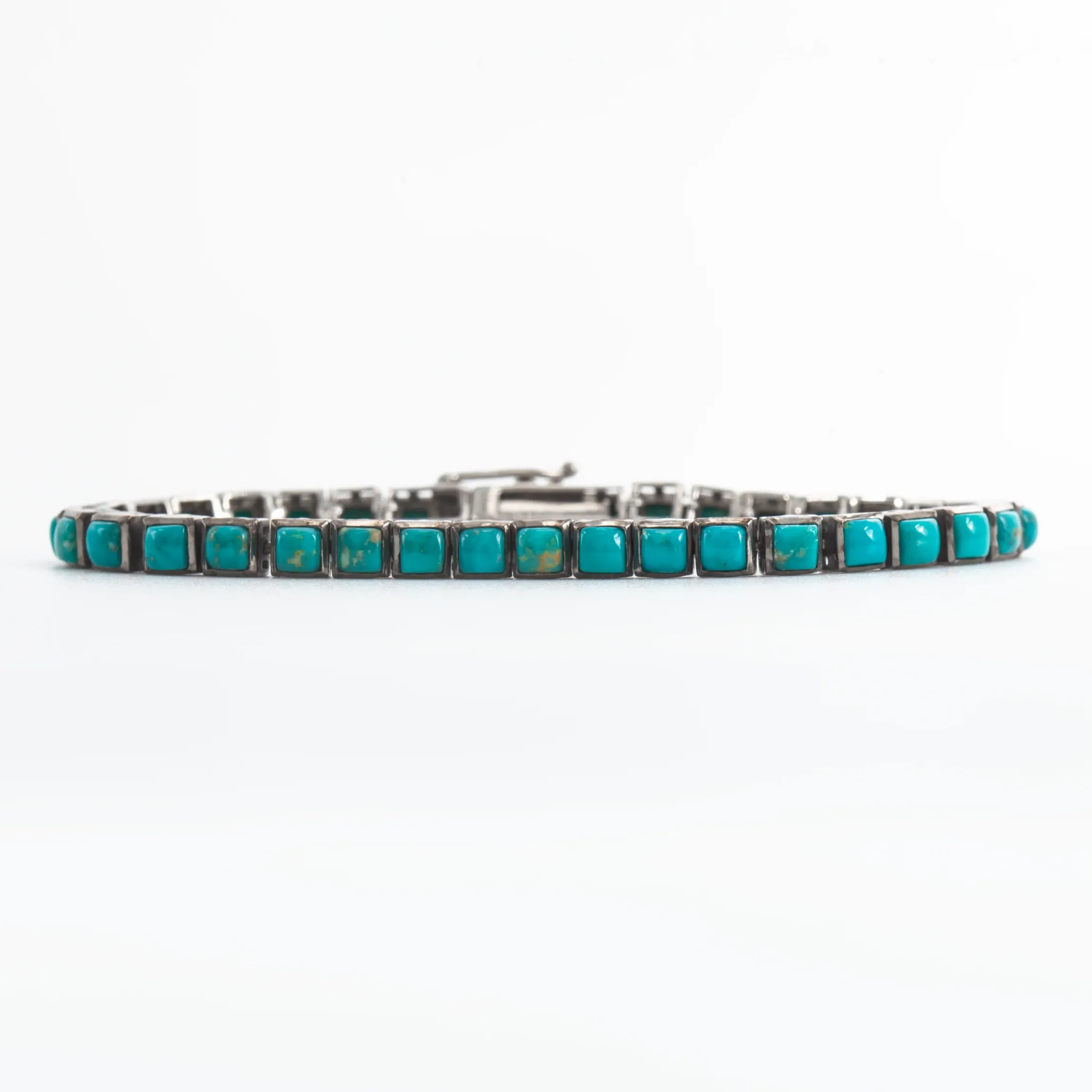 Experience the ultimate luxury and wearability of Nakard jewelry with this brand-new Turquoise Mini Tile Tennis Bracelet. Utilizing innovative metalworking techniques and experiential design, Nak Armstrong crafted this piece with genuine, turquoise stones and set it in a classic tennis bracelet design. This bracelet looks amazing and feels even better to wear. Heavy in stones and metal, this is the perfect way to add an alternative pop of color to any outfit. Designed in Austin, Texas.