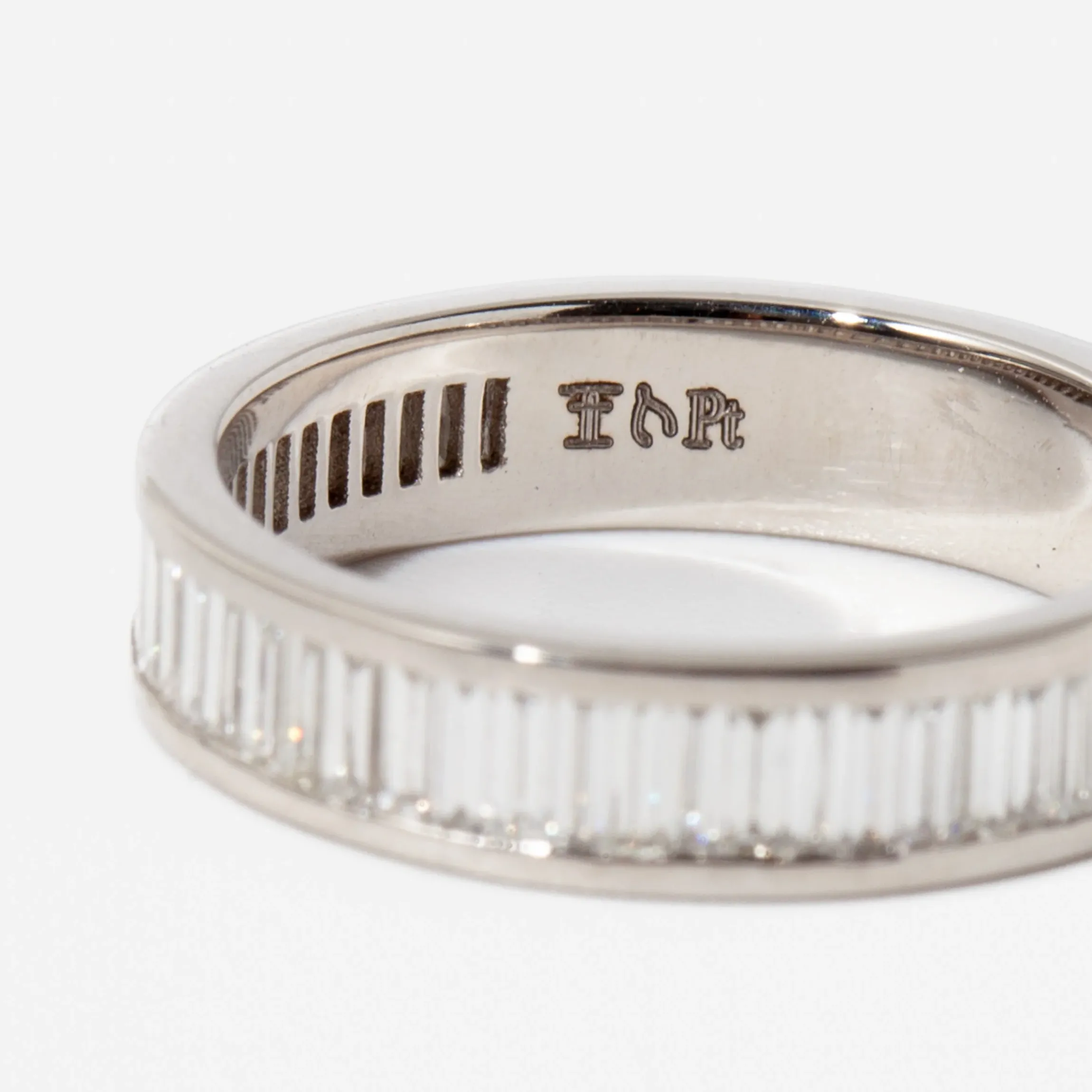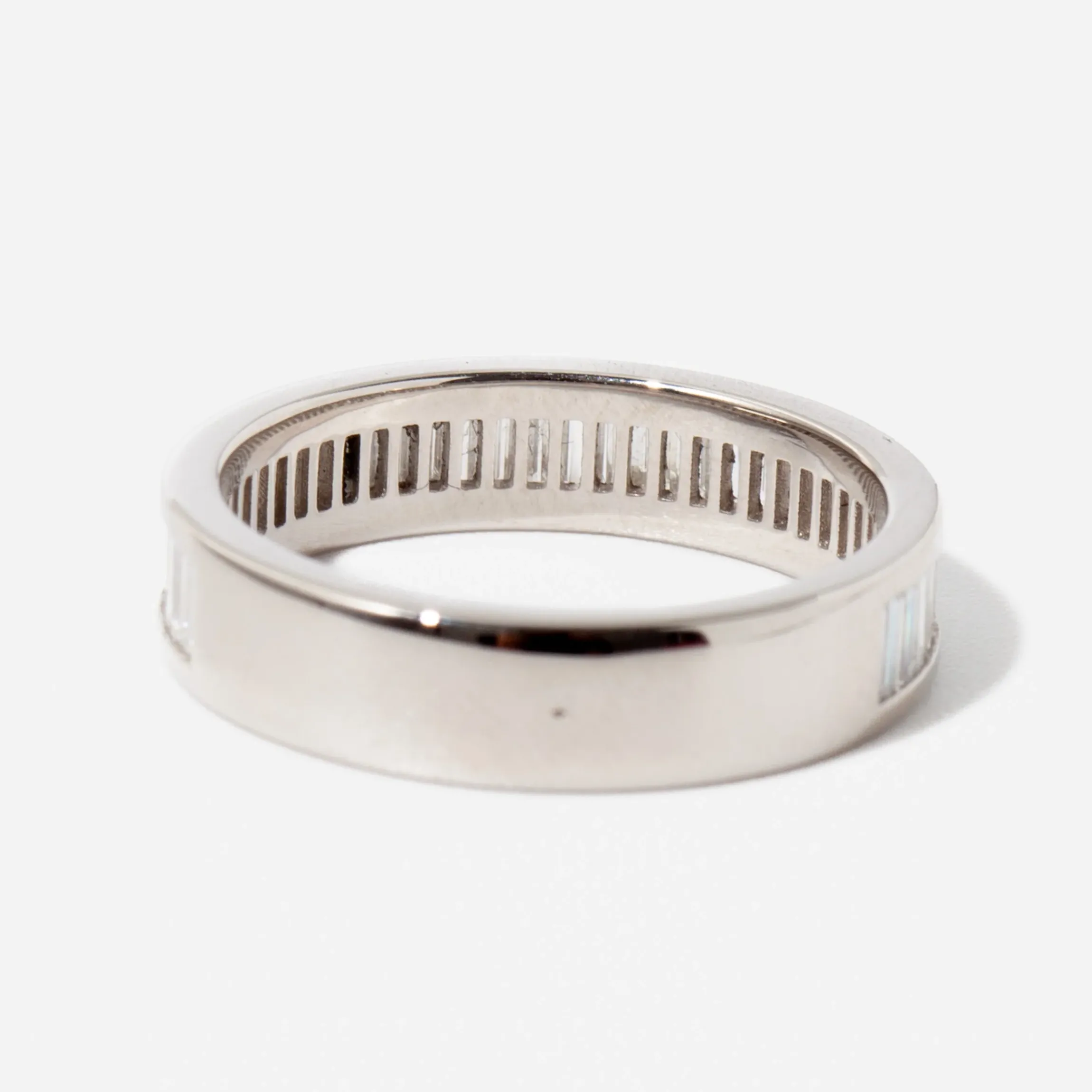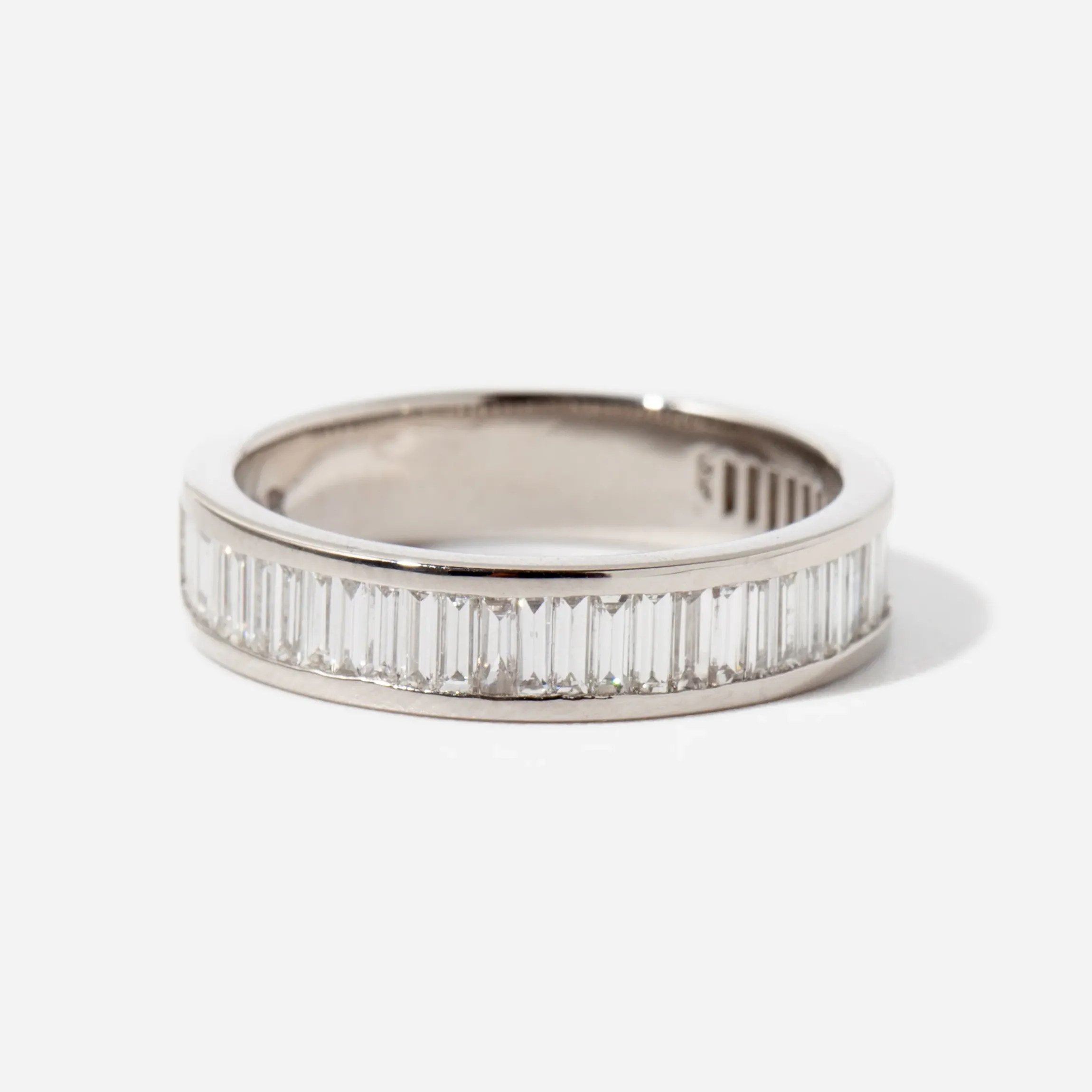 18 karat yellow/white gold or Platinum set with 41 baguette white diamonds totaling 0.98 carats. The band measures 4 mm wide.