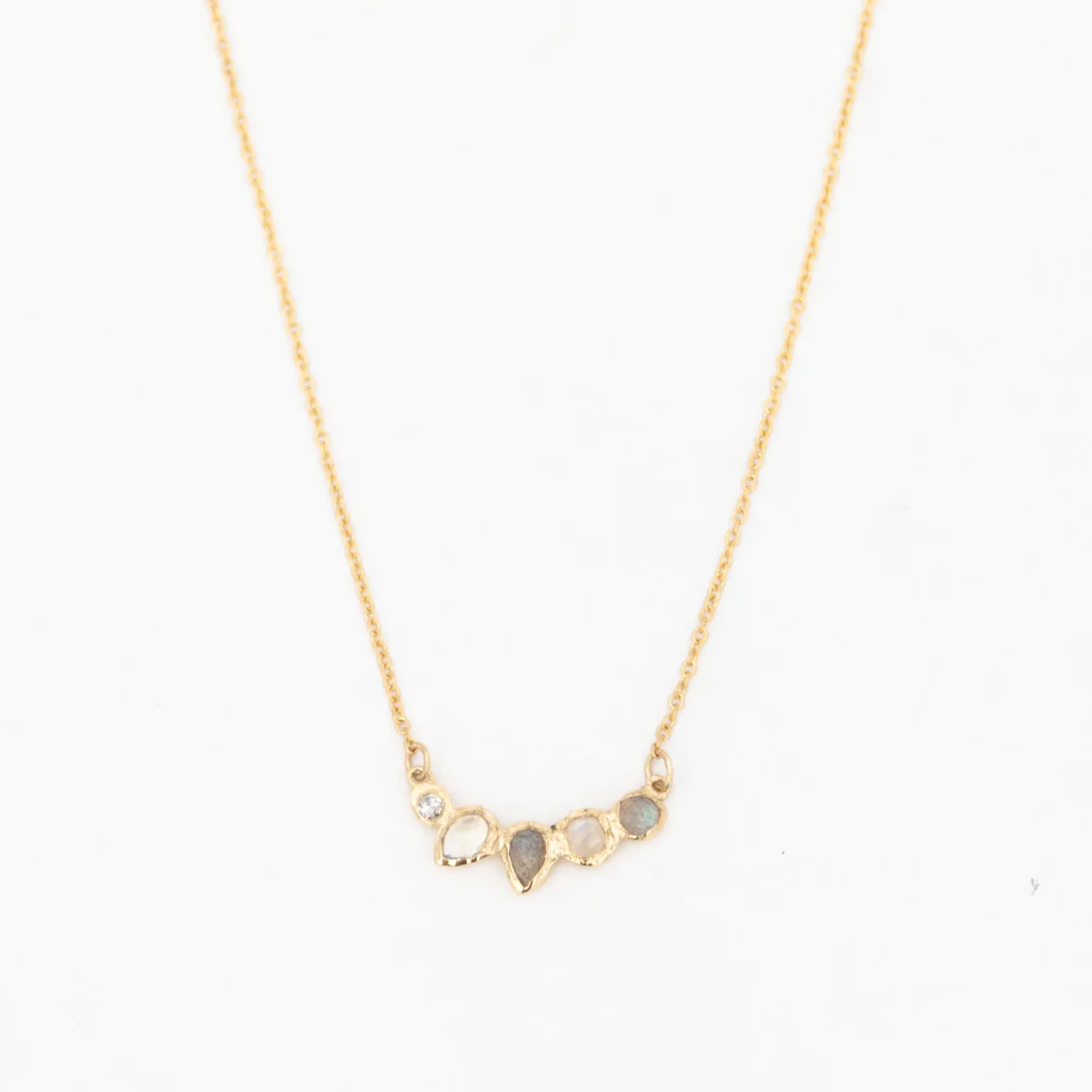 Inspired by how a seed emerges as a bud from grey waters, this necklace by Misa resembles how we strive to be the best version of ourselves—no matter how “muddy” our paths may be. The beautifully unique pendant features a bundle of grey diamond, labradorite, and rainbow moonstone that glimmers softly in the light. Perfect when worn alone, or layered with your favorite gold chains. Made in the U.S.A.