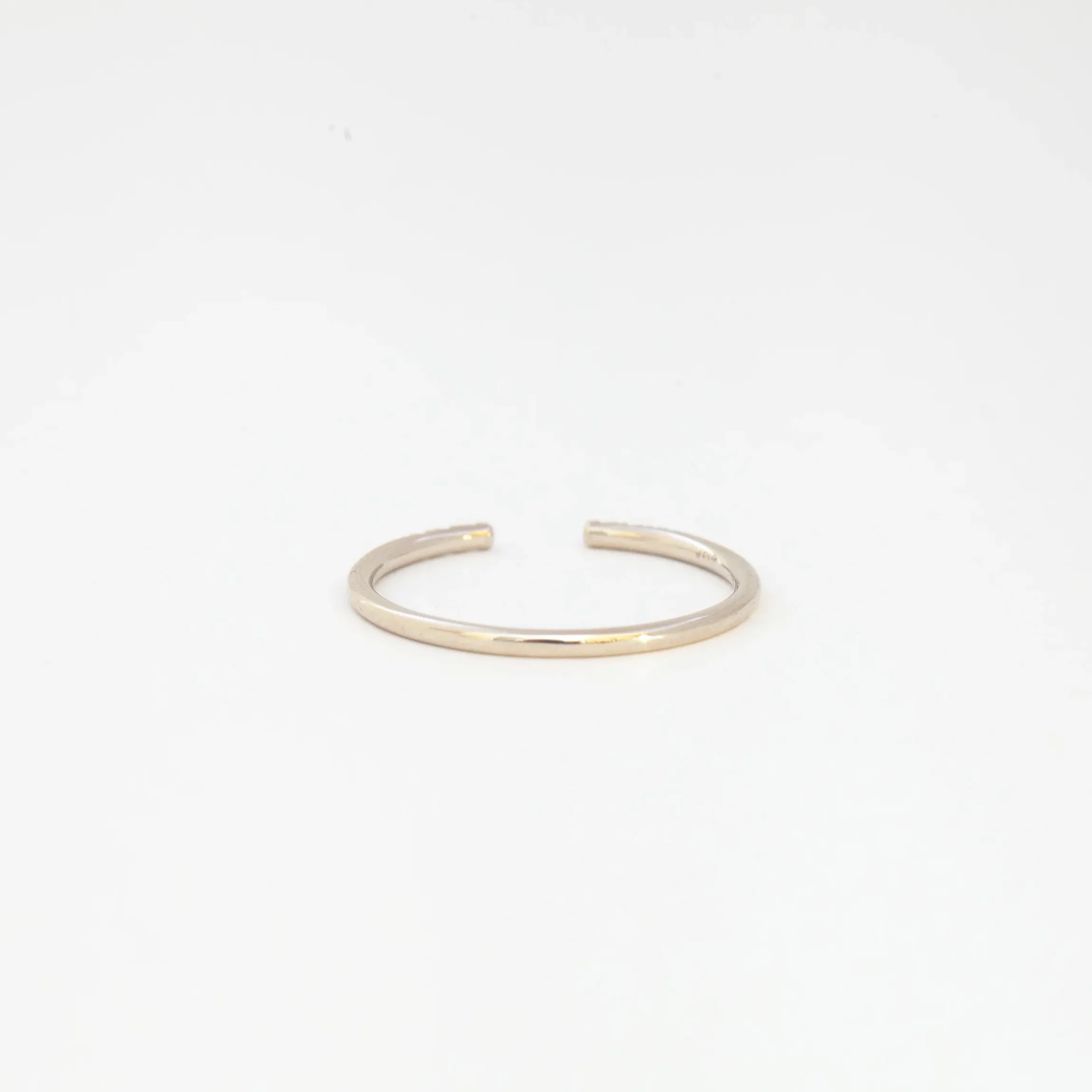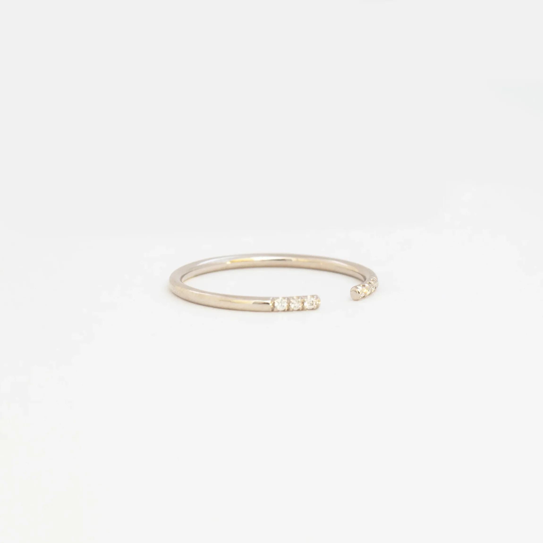An essential piece of the Jennie Kwon look, this open cuff ring is for minimalists who want a single statement and stack addicts who want something different. The elegant, hand-drawn wire is both lightweight and strong while a sprinkling of white diamonds frames the open design perfectly. Brides of a certain stripe will love how it frames their centers, especially stones set low and on delicate bands. Made in the U.S.A.
